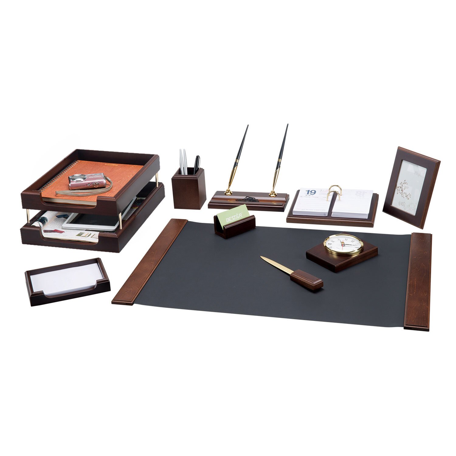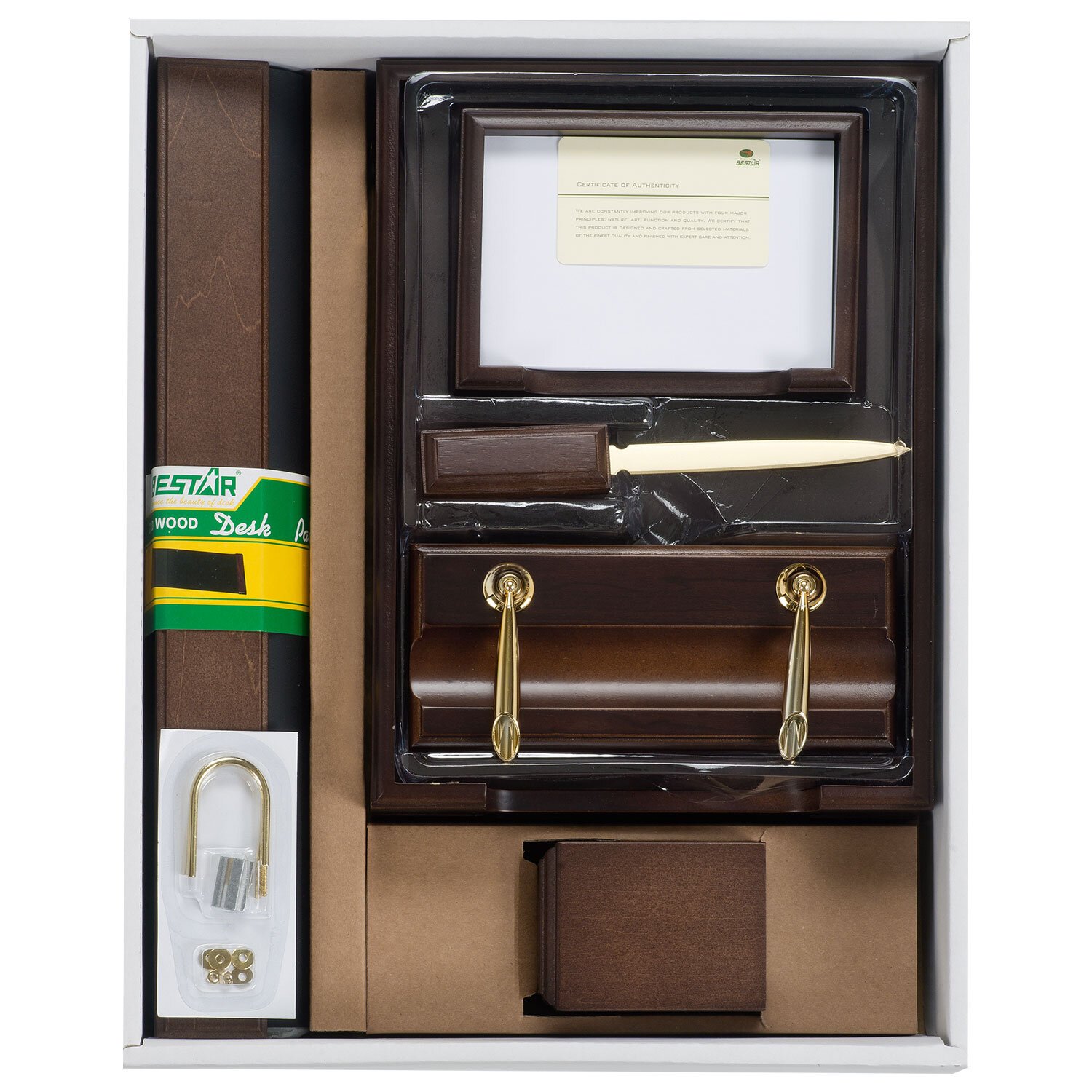 Набор состоит из 10 предметов: двойной лоток для бумаг, коврик для письма (размер - 60х42 см), подставка для ручек (2 шариковые ручки в комплекте), стакан-подставка для письменных принадлежностей, подставка для бумажного блока, подставка для визиток, нож для вскрытия конвертов, подставка для перекидного календаря, фоторамка, часы. Все предметы изготовлены из дерева цвета "орех" с золотистой фурнитурой. Набор упакован в подарочную коробку.