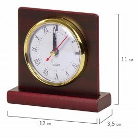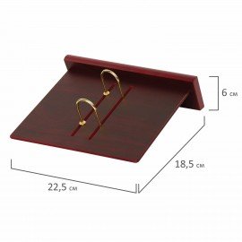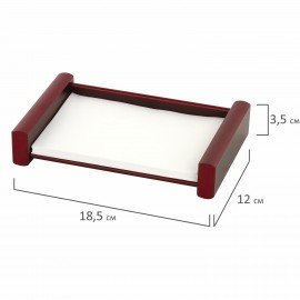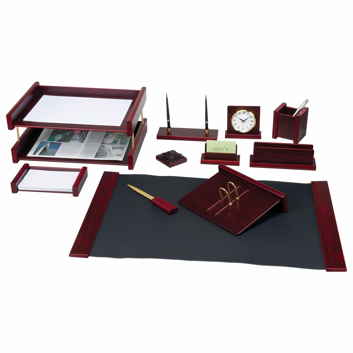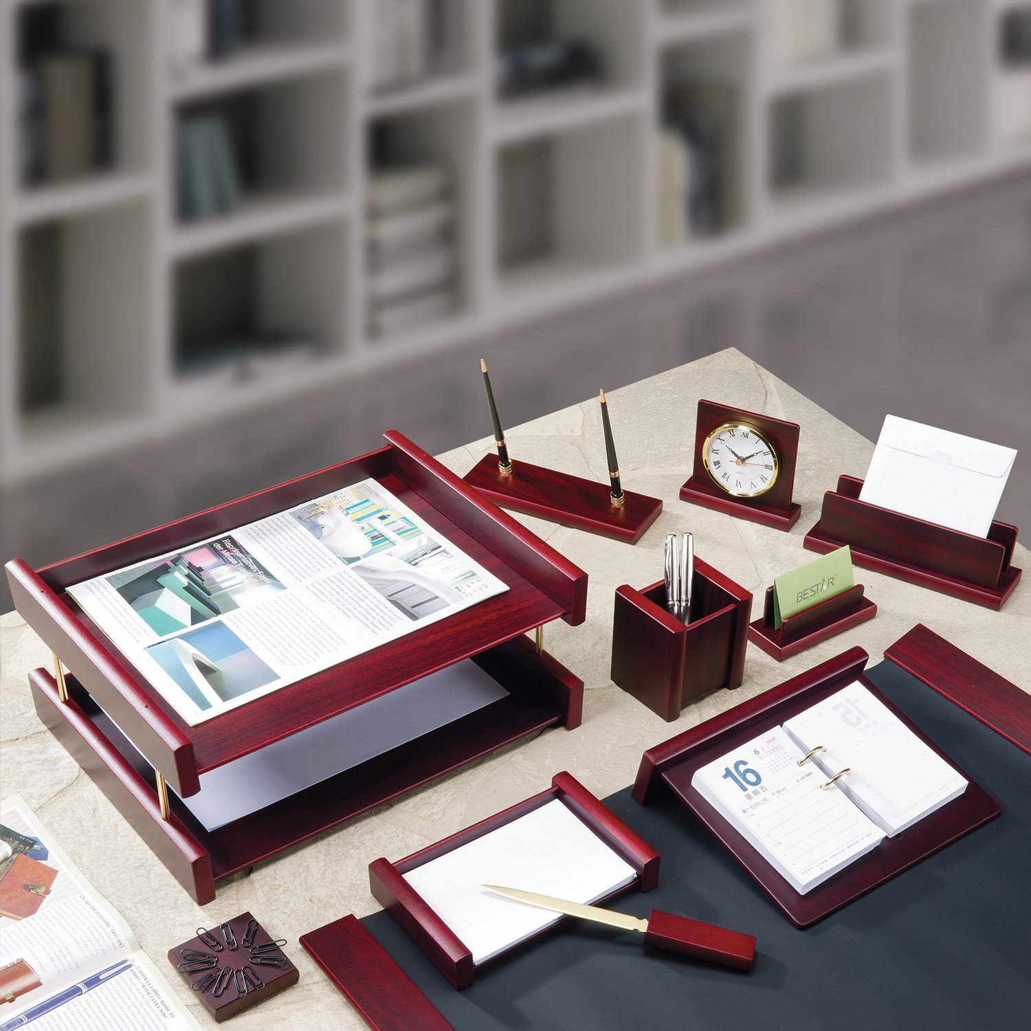 Набор состоит из 11 предметов: двойной лоток для бумаг, коврик для письма (размер - 66х43 см), подставка для ручек (2 шариковые ручки в комплекте), стакан-подставка для письменных принадлежностей, подставка для бумажного блока, подставка для визиток, нож для вскрытия конвертов, подставка для писем, скрепочница магнитная, подставка для перекидного календаря, часы. Все предметы изготовлены из дерева красного цвета с золотистой фурнитурой. Набор упакован в фирменную подарочную коробку.