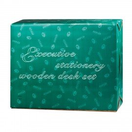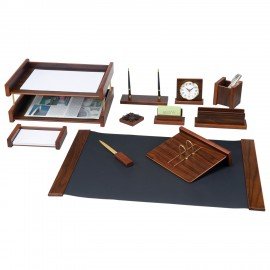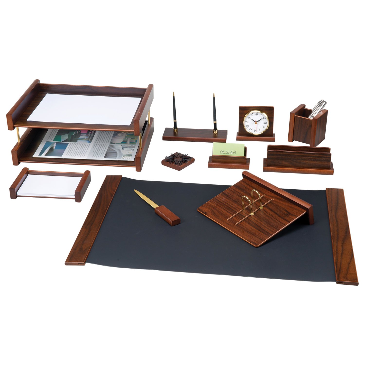 Набор состоит из 11 предметов: двойной лоток для бумаг, коврик для письма (размер - 66х43 см), подставка для ручек (2 шариковые ручки в комплекте), стакан-подставка для письменных принадлежностей, подставка для бумажного блока, подставка для визиток, нож для вскрытия конвертов, подставка для писем, скрепочница магнитная, подставка для перекидного календаря, часы. Все предметы изготовлены из дерева цвета "орех" с золотистой фурнитурой. Набор упакован в фирменную подарочную коробку.