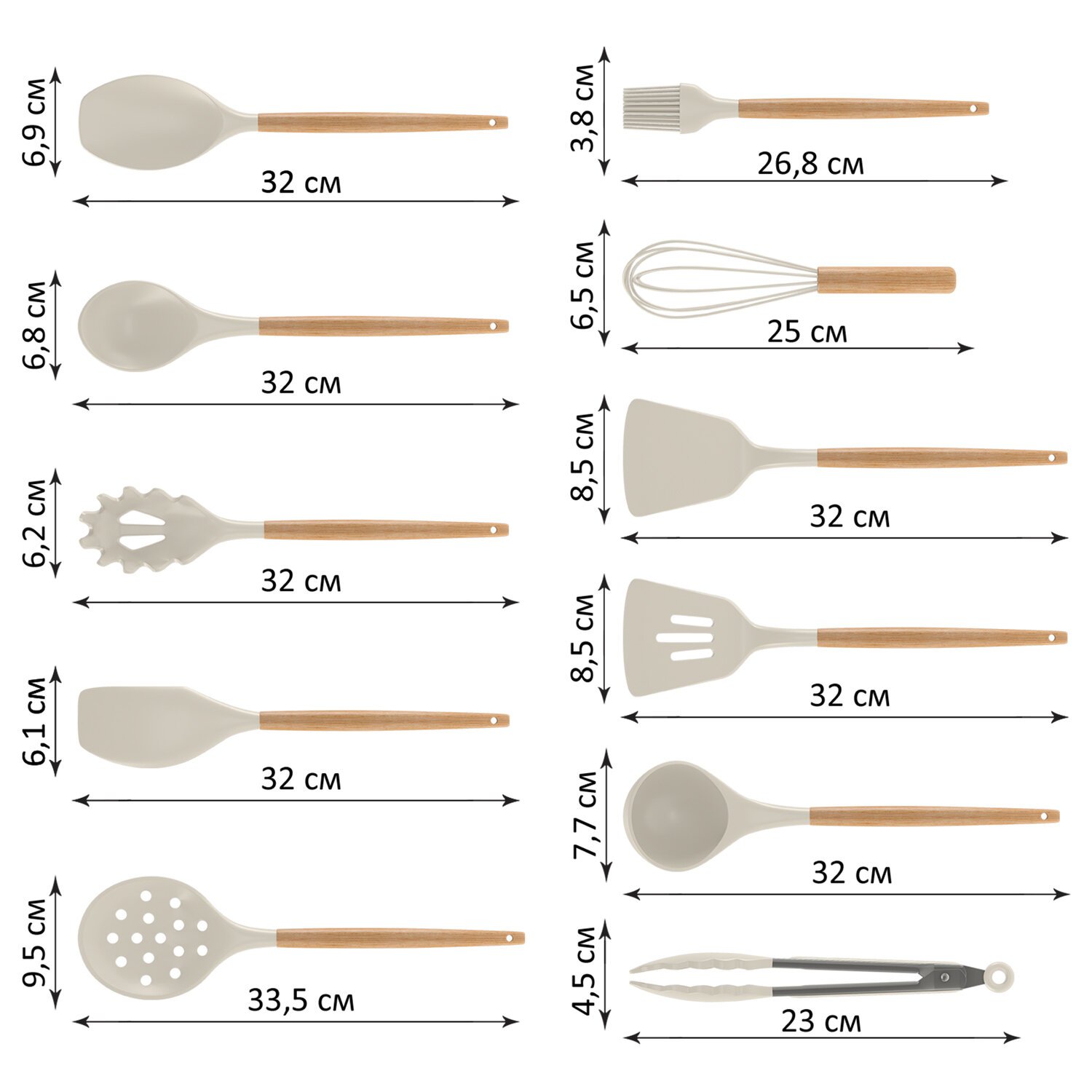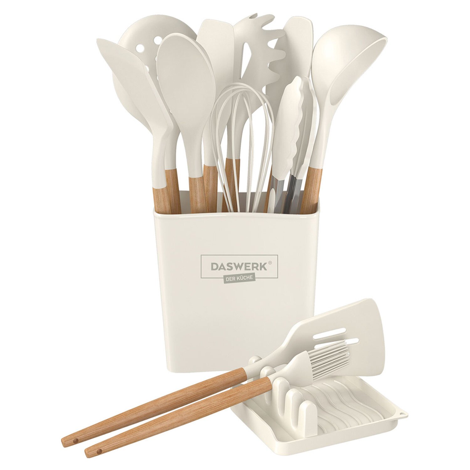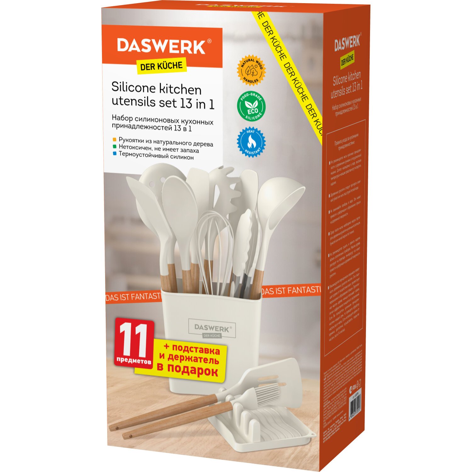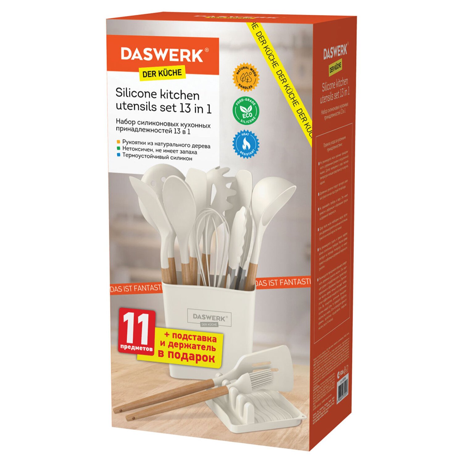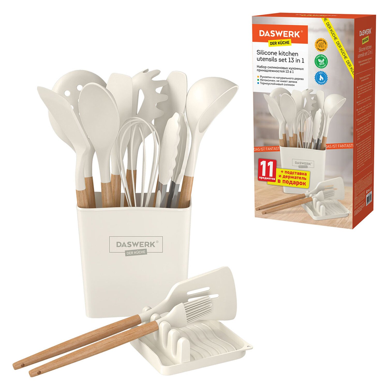 Набор силиконовых кухонных принадлежностей с деревянными ручками 13 в 1, молочный, DASWERK, 608196