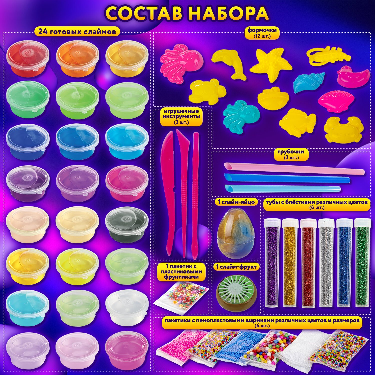 В набор входят 24 слайма в стандартных баночках весом 50-55 грамм, 1 слайм-яйцо и 1 слайм-фрукт, 6 пакетиков с пенопластовыми шариками различных цветов и размеров, 1 пакетик с пластиковыми фруктиками, 6 туб с блёстками различных цветов, а также формочки, игрушечные инструменты и трубочки для надувания слаймов.