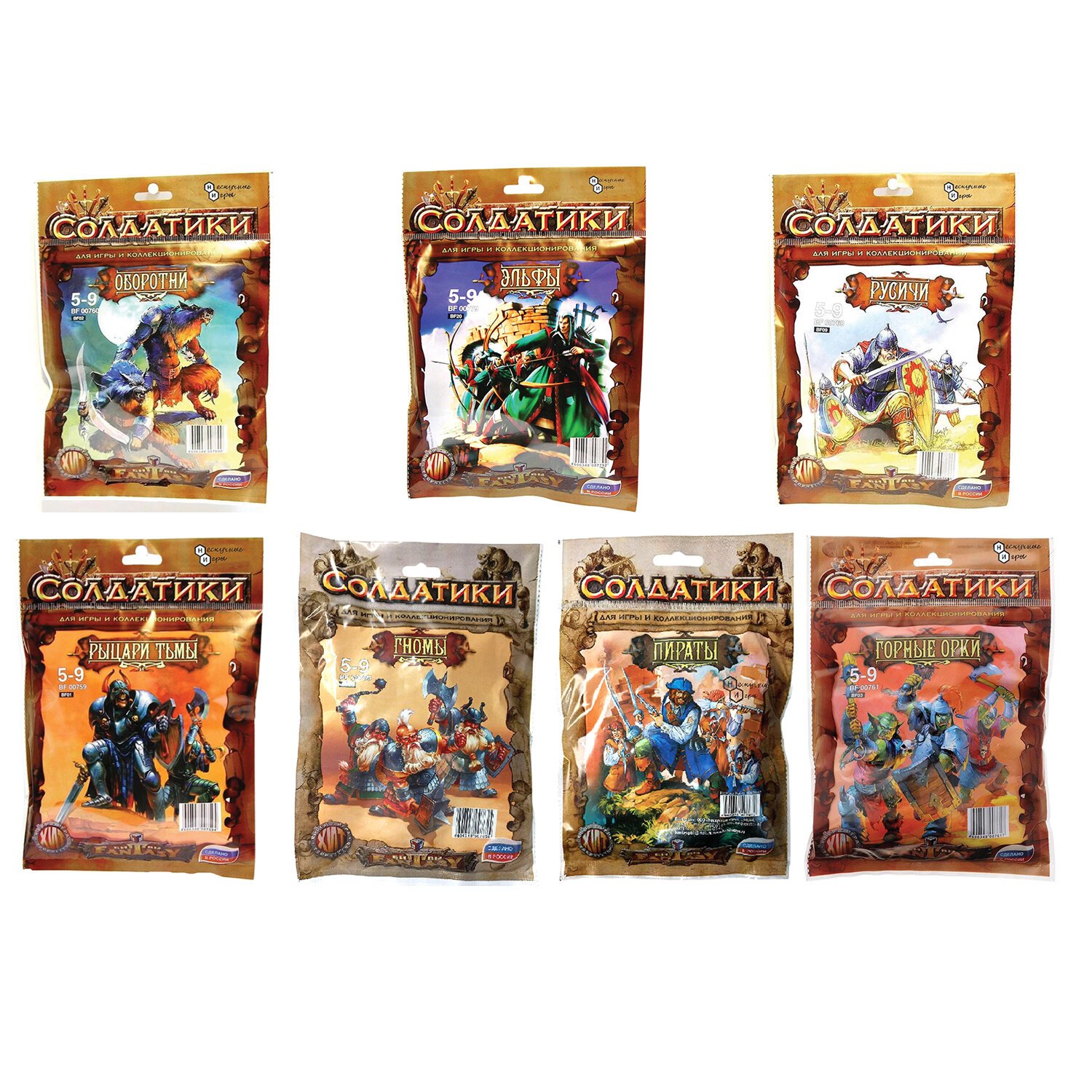 Виды солдатиков: "Орки-мутанты", "Оборотни", "Горные орки", "Викинги, "Верховные эльфы", "Варяги", "Русичи", "Эльфы", "Рыцари тьмы".