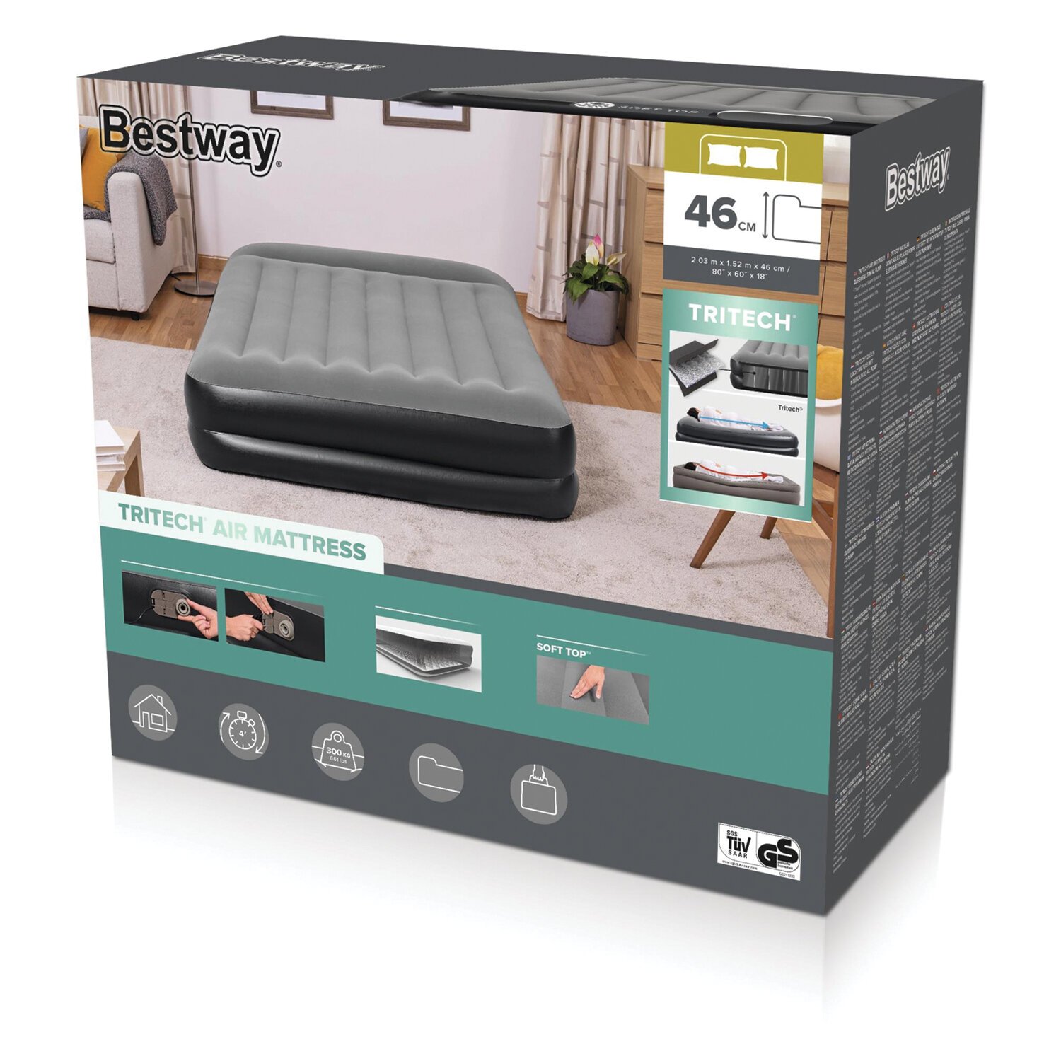 Двуспальная надувная кровать Tritech модели 67403 изготовлена по технологии I-Beam Construction. Внутренние перегородки под весом тела не деформируются и постоянно остаются устойчивыми. Вес распространяется равномерно по всей площади надувной кровати. Кровать имеет удобный подголовник. Приятное флокированное покрытие (искусственная замша) поверхности кровати не даёт соскальзывать постельному белью, легко чистится без применения специальных средств. Кровать имеет надежный встроенный электронасос, который позволяет за несколько минут надувать и сдувать кровать, а также даёт возможность отрегулировать её упругость. Насос подключается к стандартной электрической розетке. При отсутствии электричества, кровать можно накачать обычным механическим насосом. Для этого кровать снабжена специальным клапаном для подключения внешнего насоса. В комплект входит удобная сумка для переноски кровати и специальная самоклеющаяся заплатка. Характеристики: Серия: Tritech Airbed. Размер: 152х203х46 см. Высота спального места: 46 см. Вес упаковки: 7,04 кг. Максимальная нагрузка: 300 кг. Время накачивания: 4 мин.