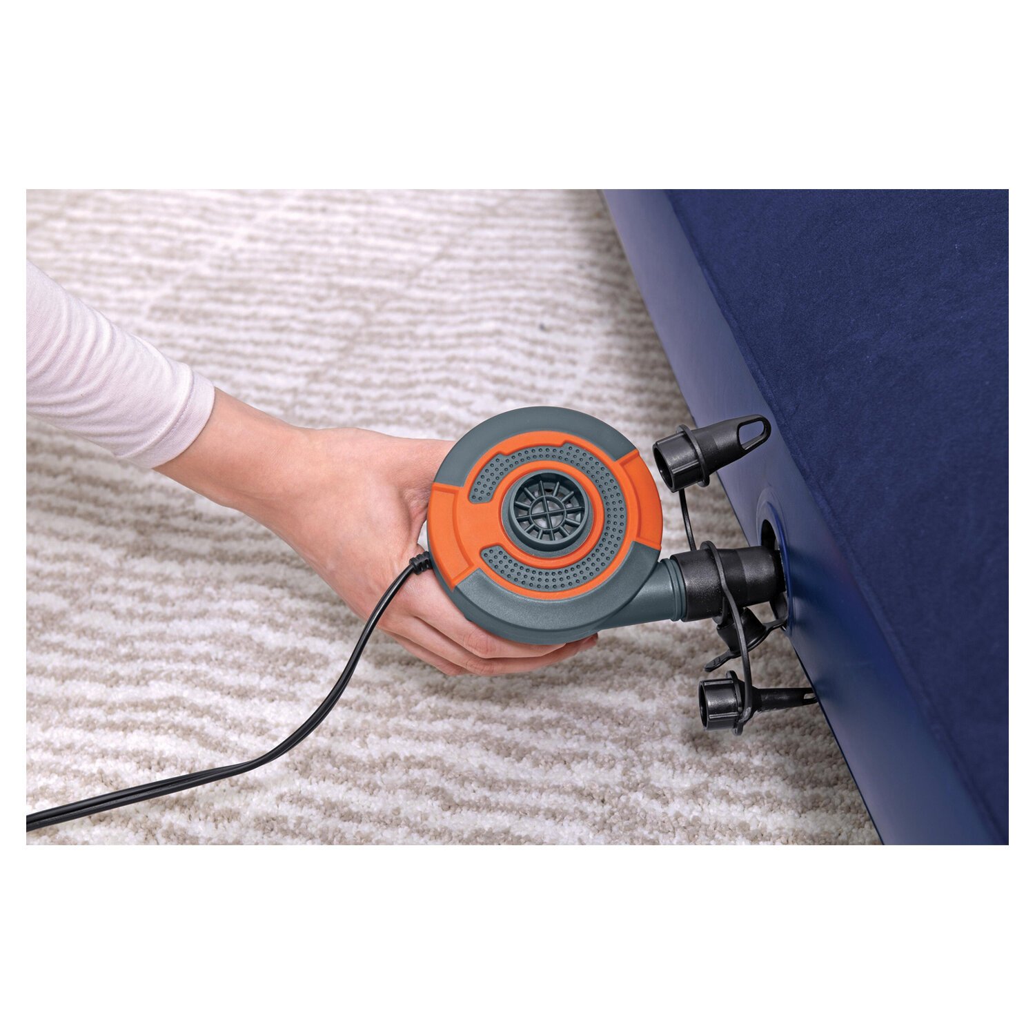 Высококачественное флокированное покрытие верхней поверхности матраса, которое напоминает велюр, не даст соскальзывать постельному белью, легко чистится без применения специальных средств. Матрас оснащен универсальным клапаном для накачивания и сдувания – подойдет любой тип насоса: ручной, ножной, электрический. В комплект насос не входит, приобретается отдельно.