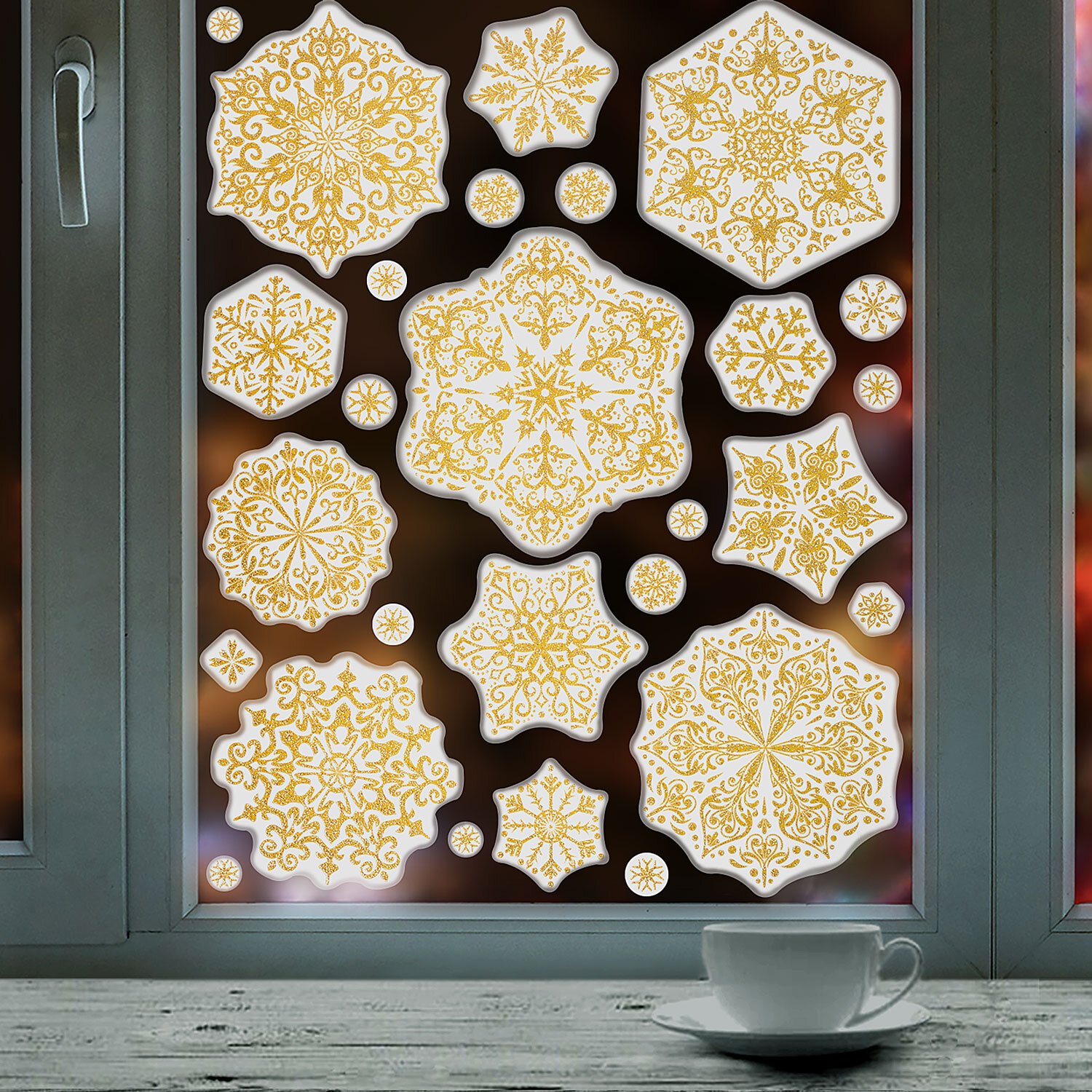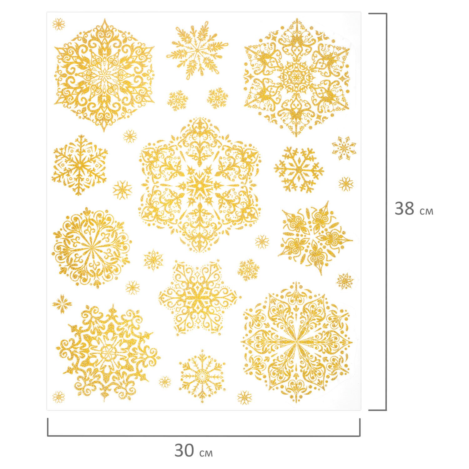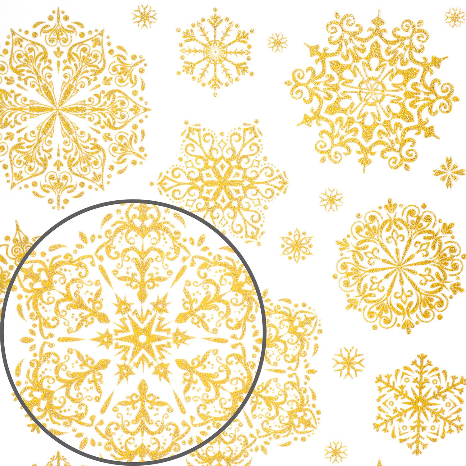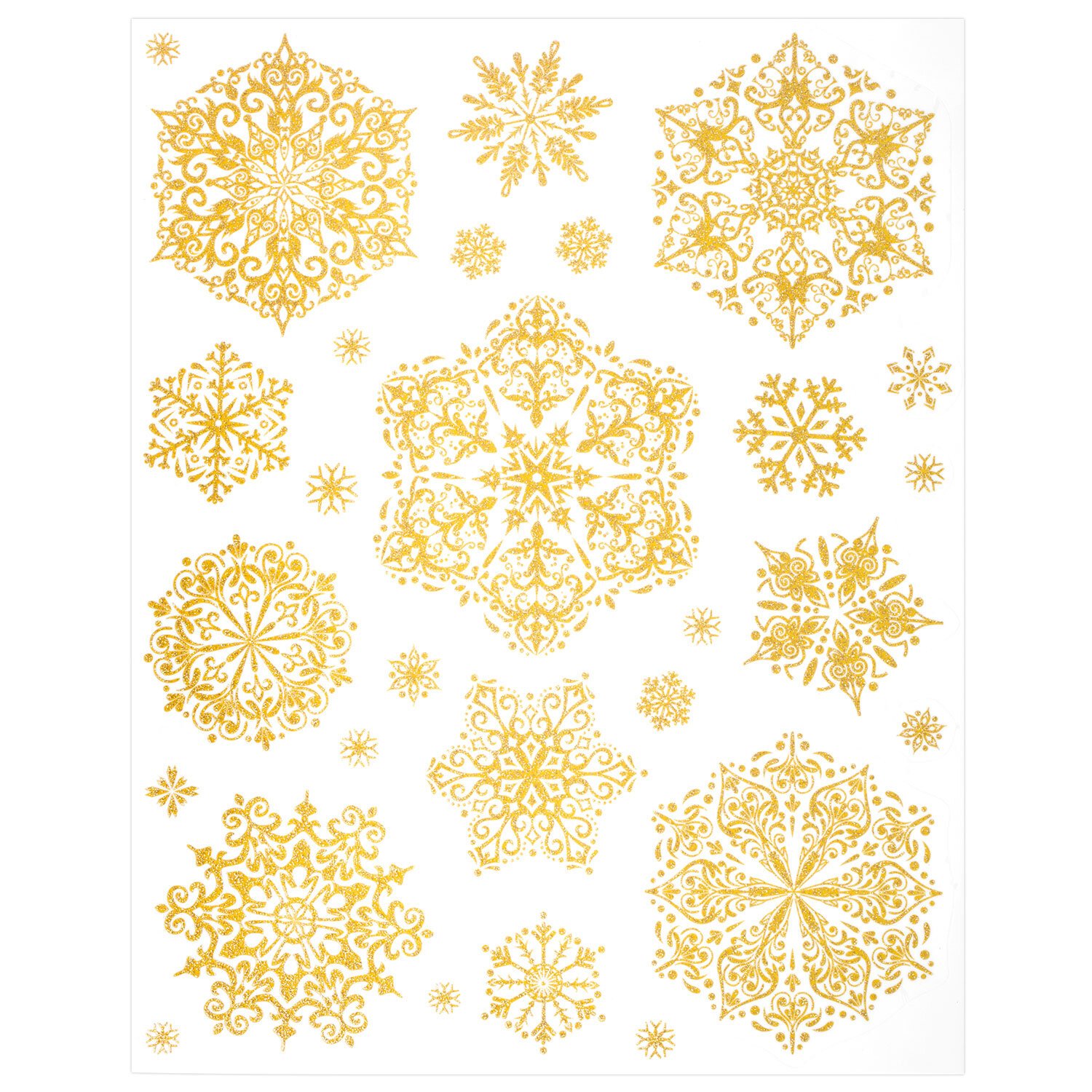Комплект наклеек с изображением снежинок изготовлен из поливинилхлорида (ПВХ). Каждый лист с наклейками размером 30x38 см декорирован золотистым глиттером. В комплекте 4 листа, на каждом - 28 снежинок.
