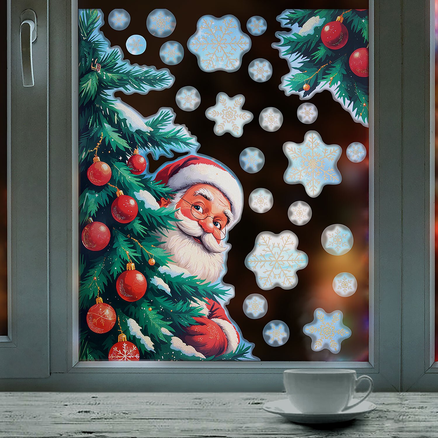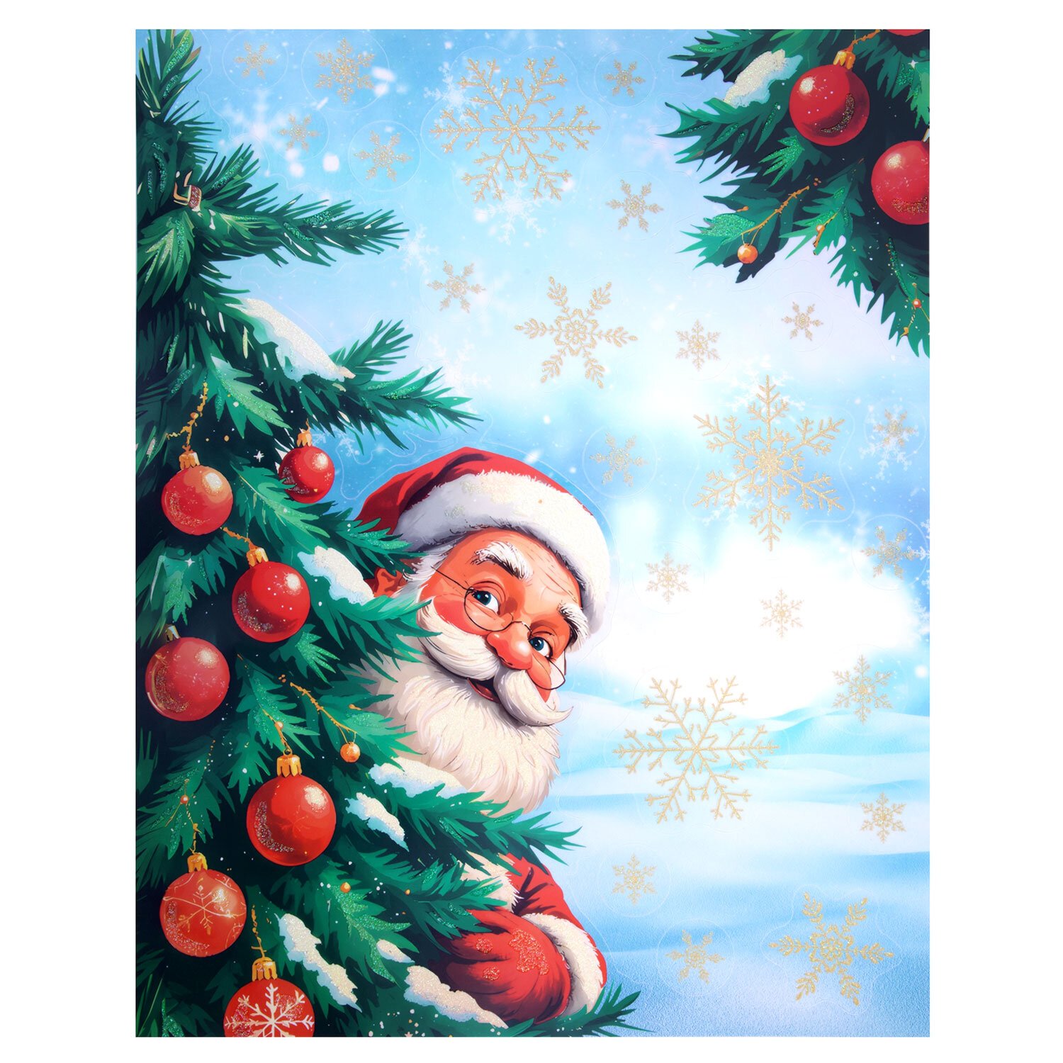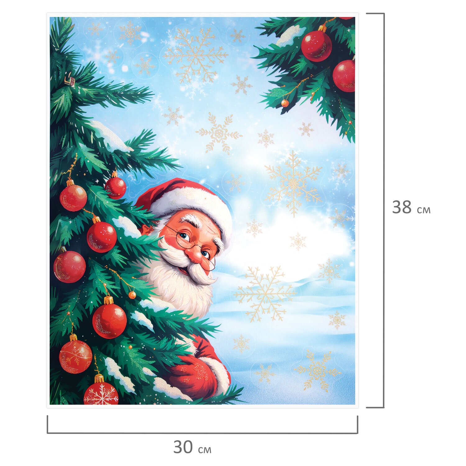 Изделие с изображением Деда Мороза и нарядной елочки представляет собой наклейку, изготовленную из поливинилхлорида (ПВХ). Наклейка размером 30x38 см декорирована золотистым глиттером.