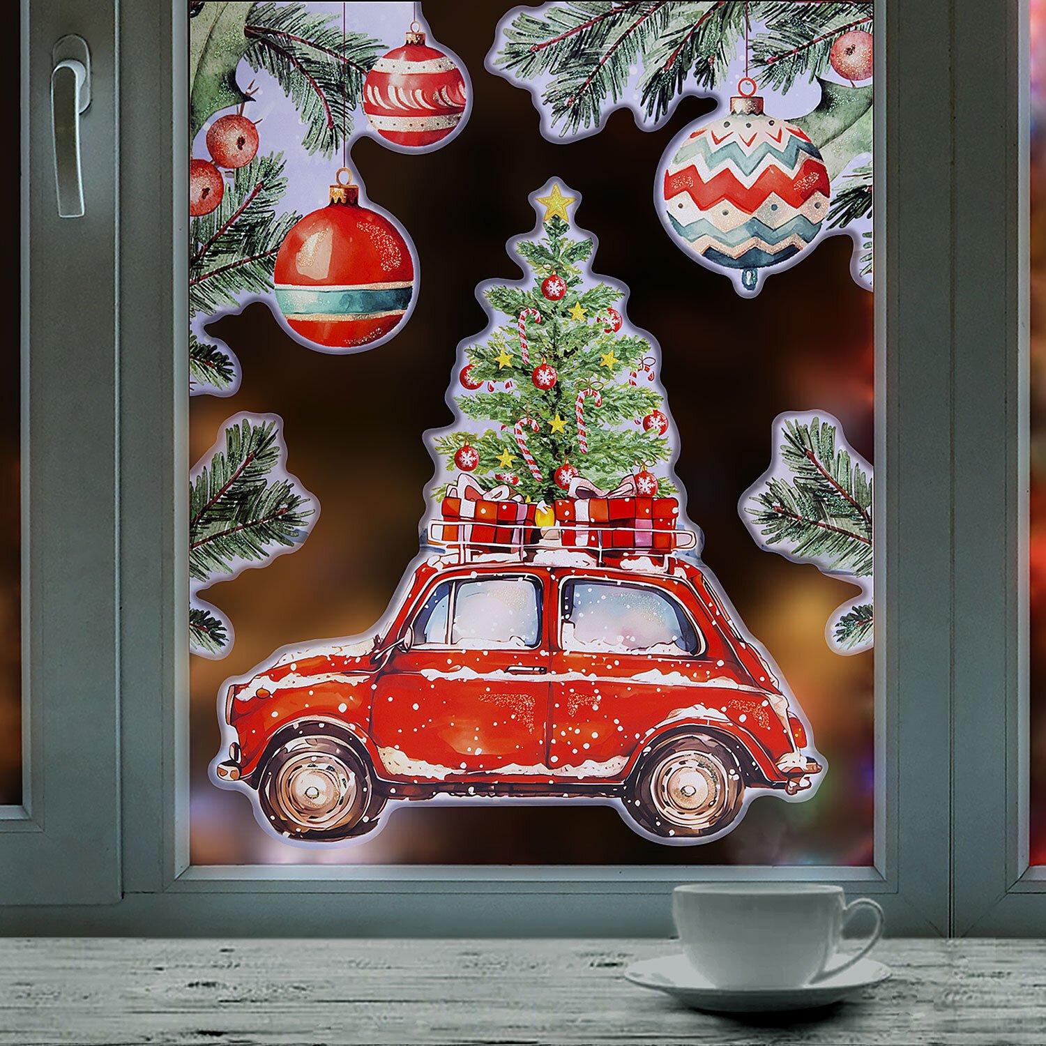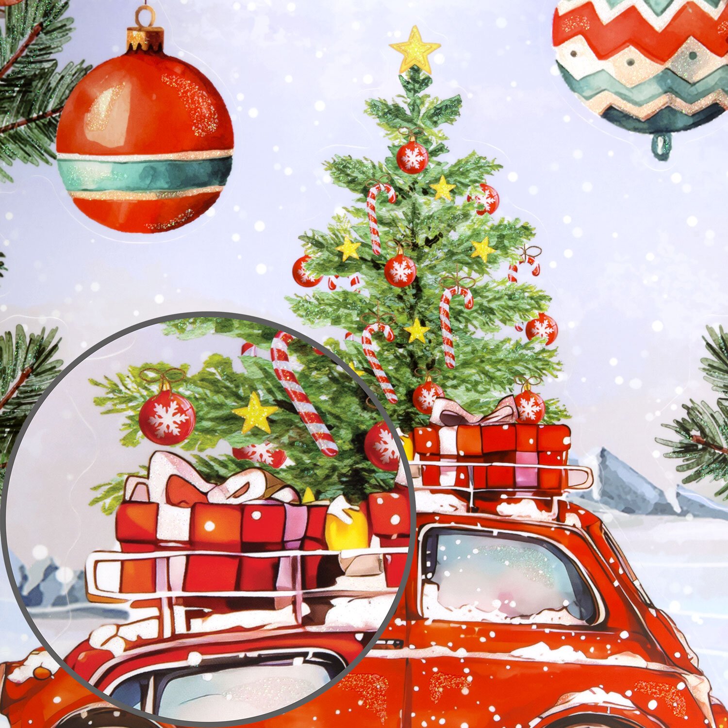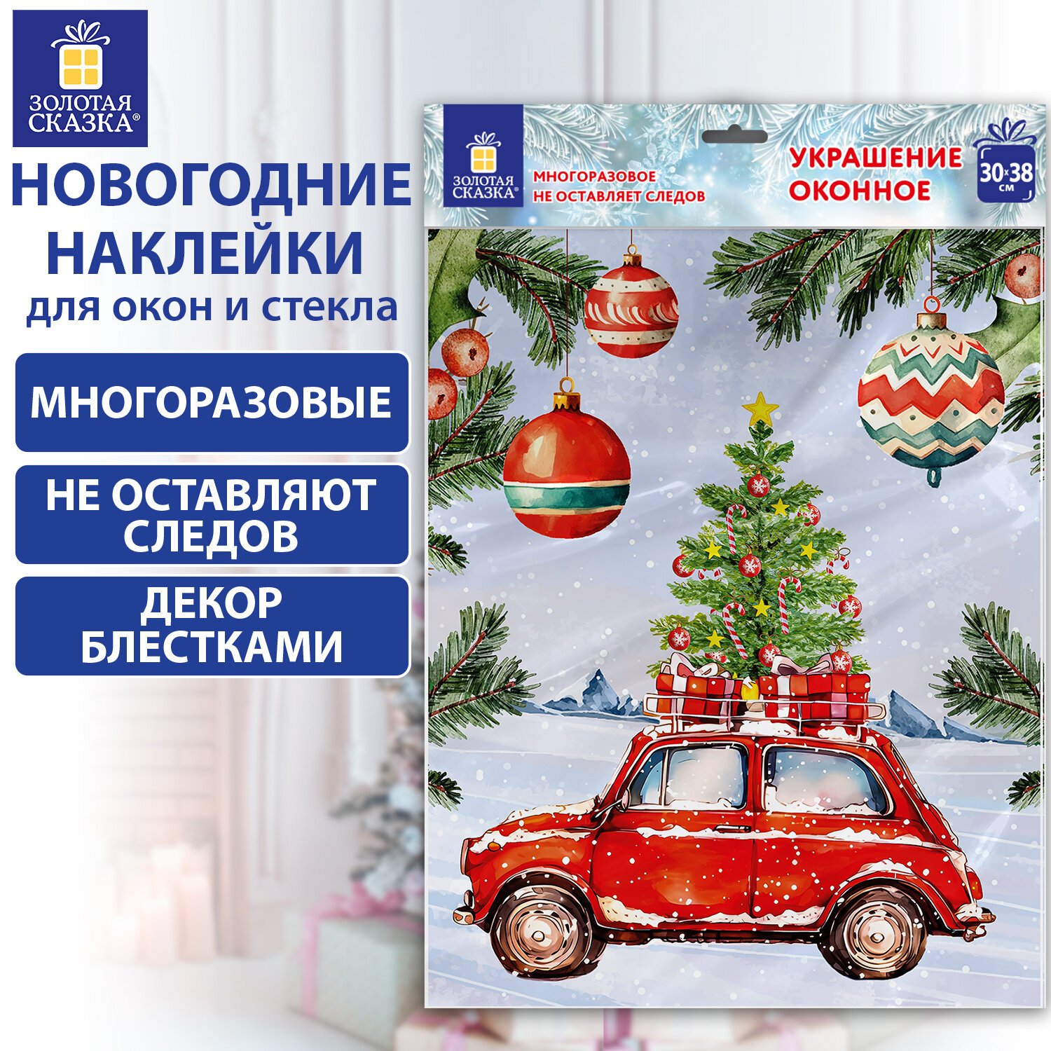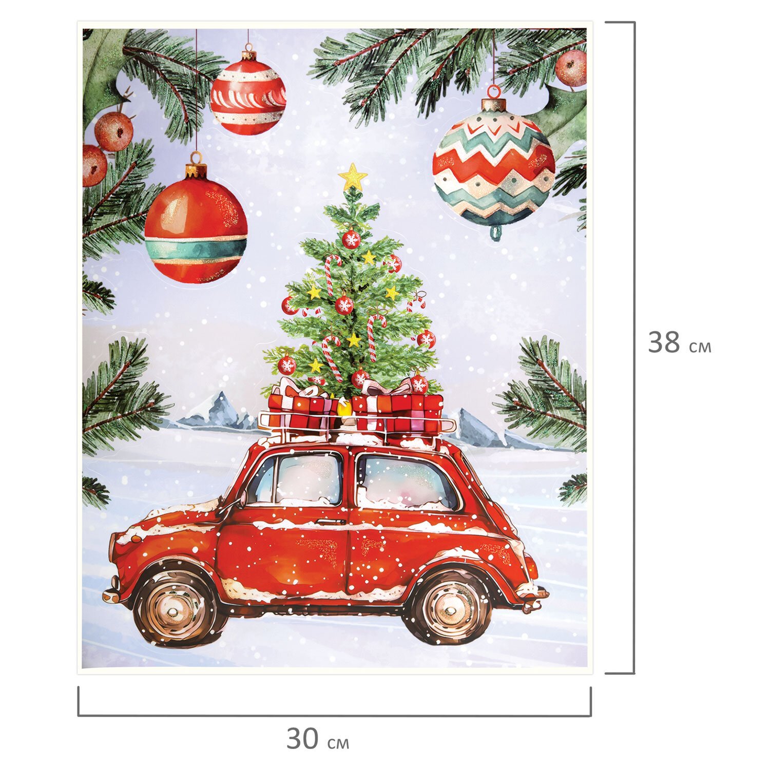 Изделие с изображением машинки и нарядной елочки представляет собой наклейку, изготовленную из поливинилхлорида (ПВХ). Наклейка размером 30x38 см декорирована серебристым глиттером.