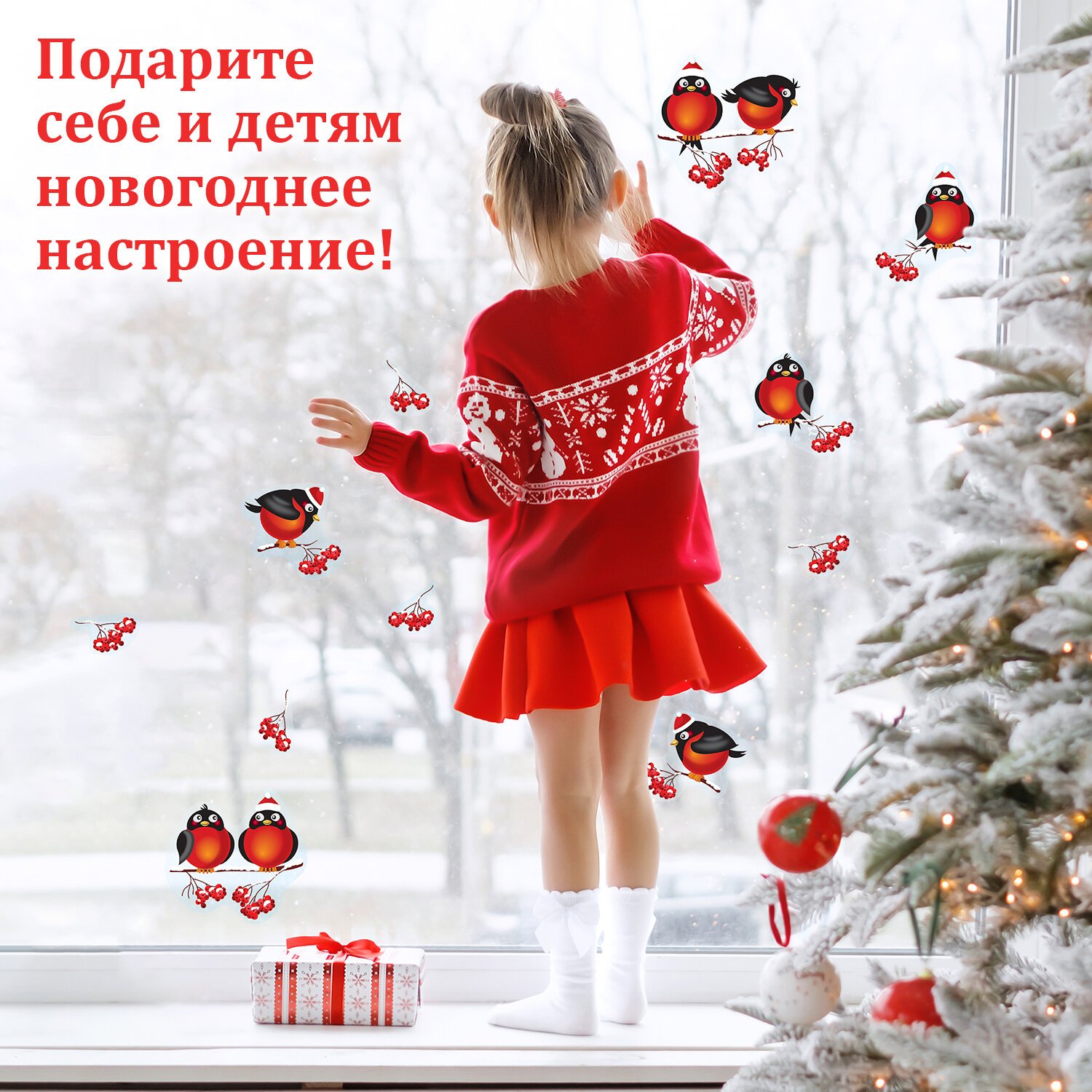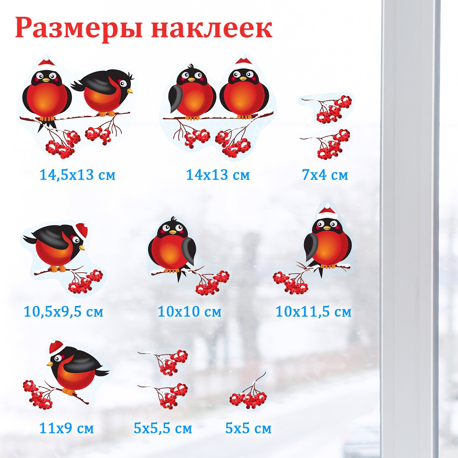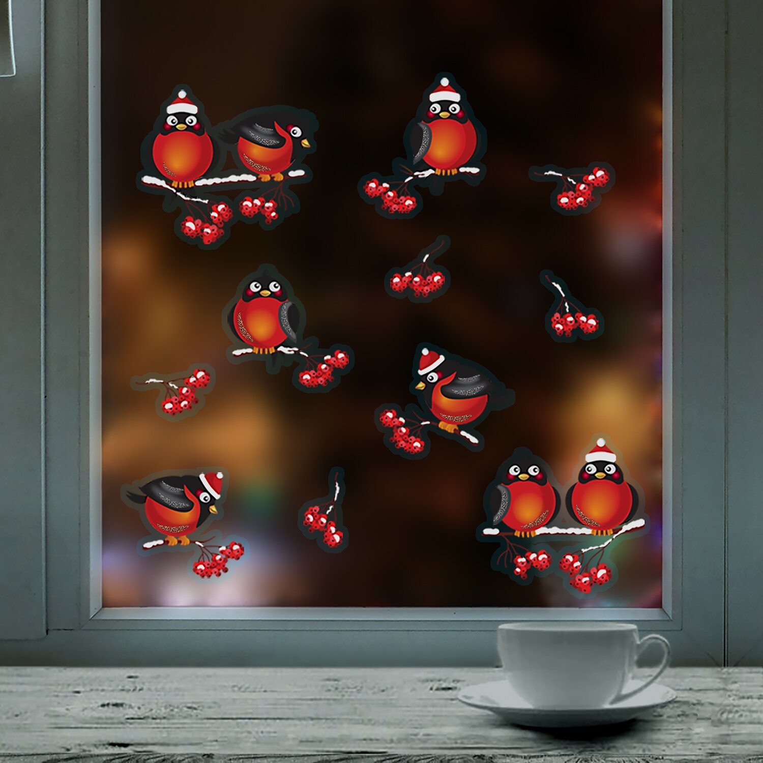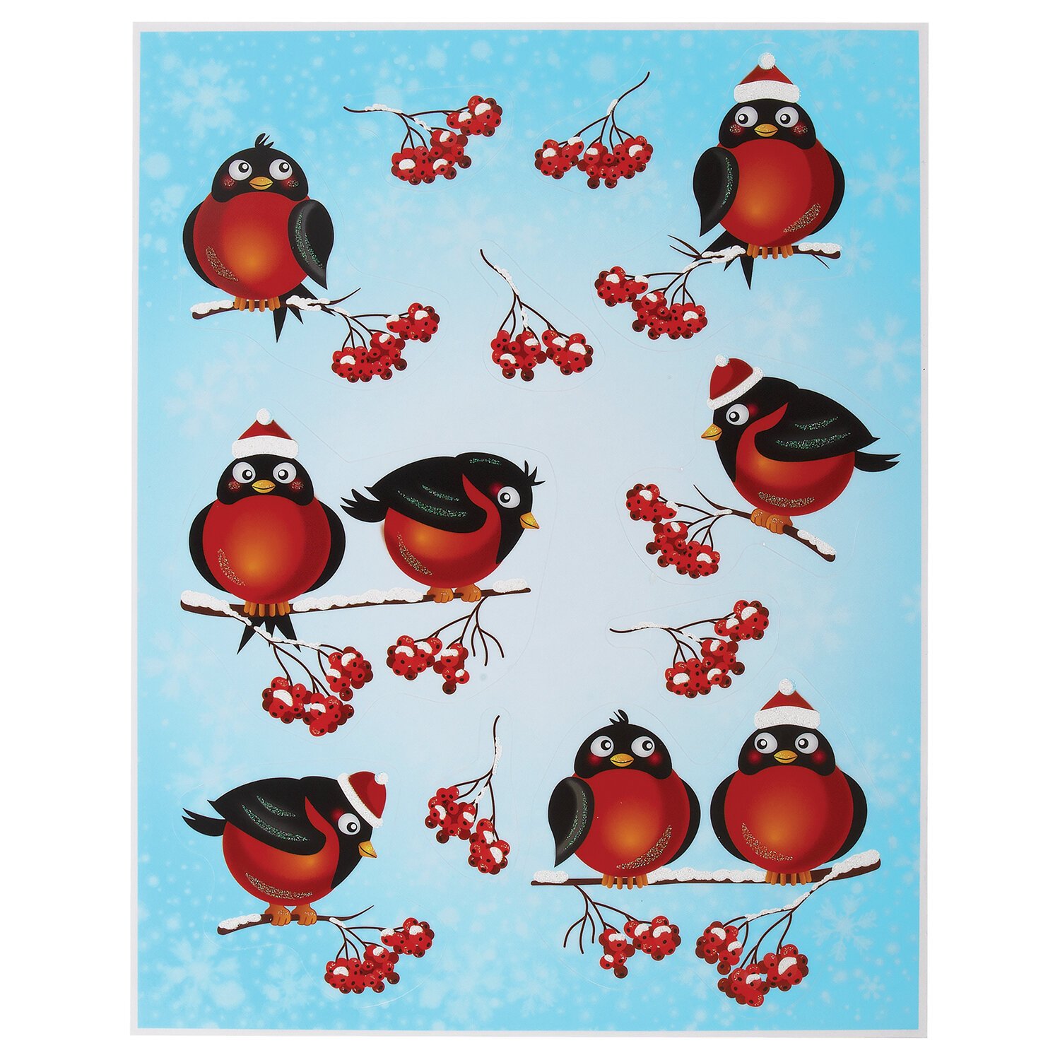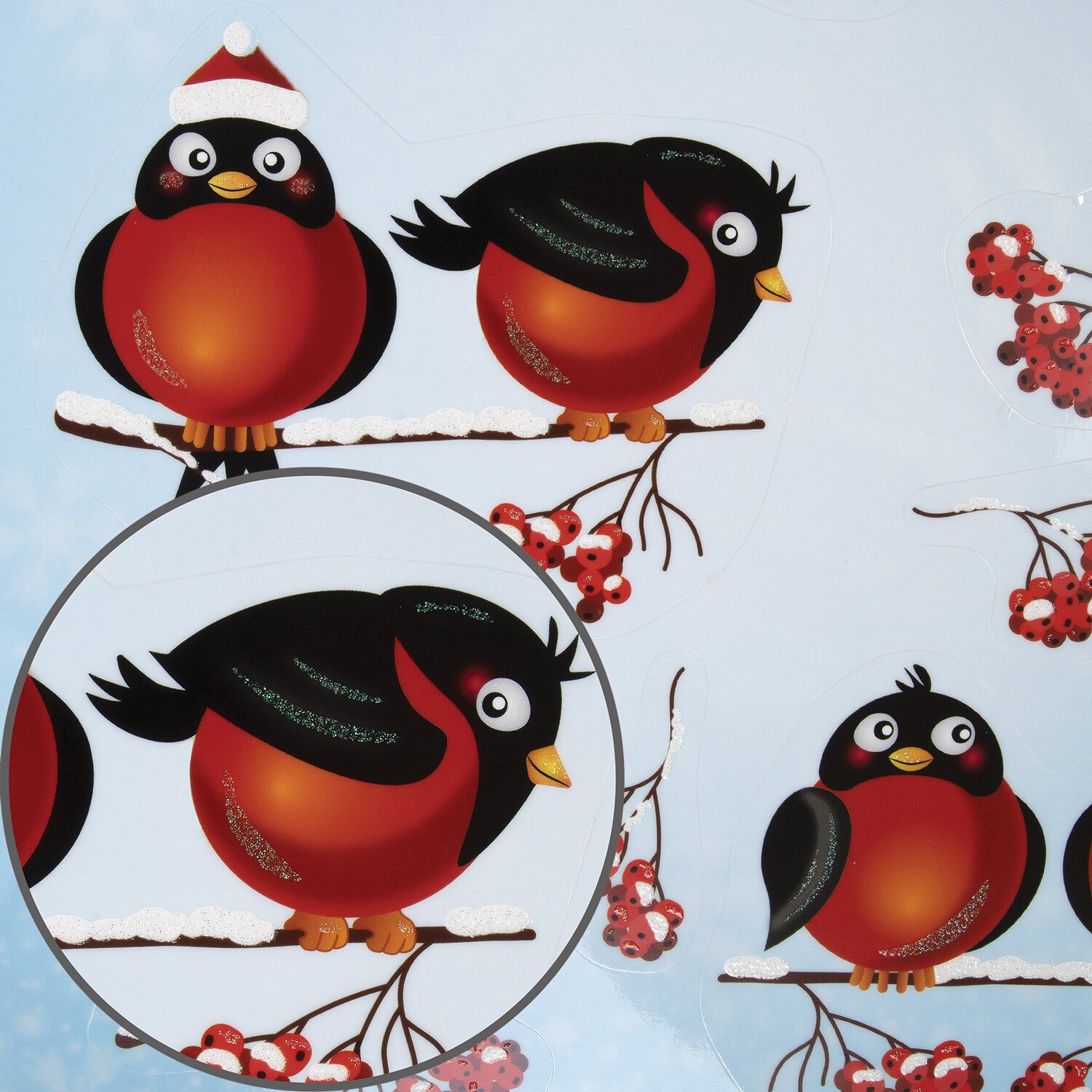 Изделие с изображением снегирей представляет собой наклейку, изготовленную из поливинилхлорида (ПВХ). Наклейка размером 30x38 см декорирована разноцветным глиттером. Украшение предназначено для декорирования окон, зеркал, стекол и других ламинированных глянцевых поверхностей. Не оставляет клеевых следов и предназначено для многократного использования. Крепится к поверхности посредством статического эффекта.