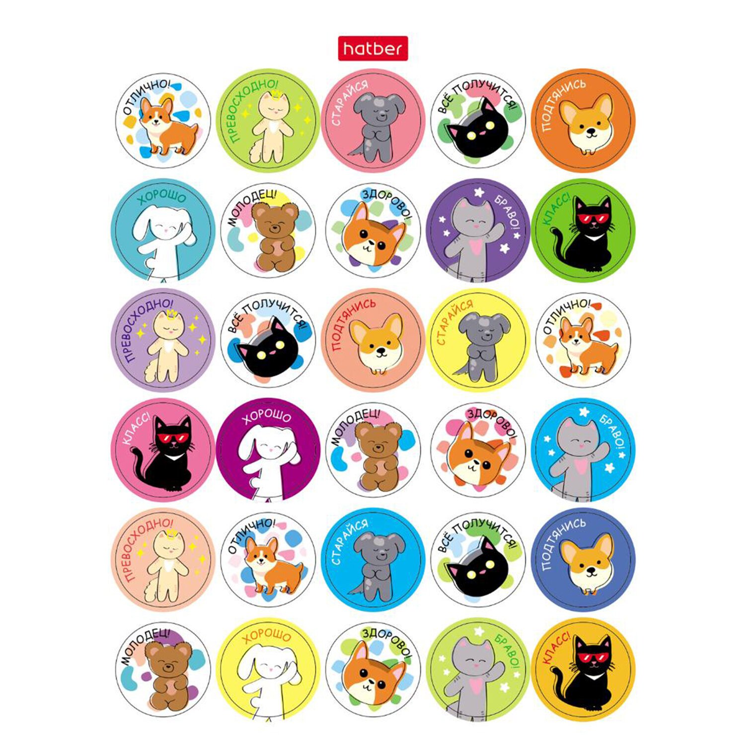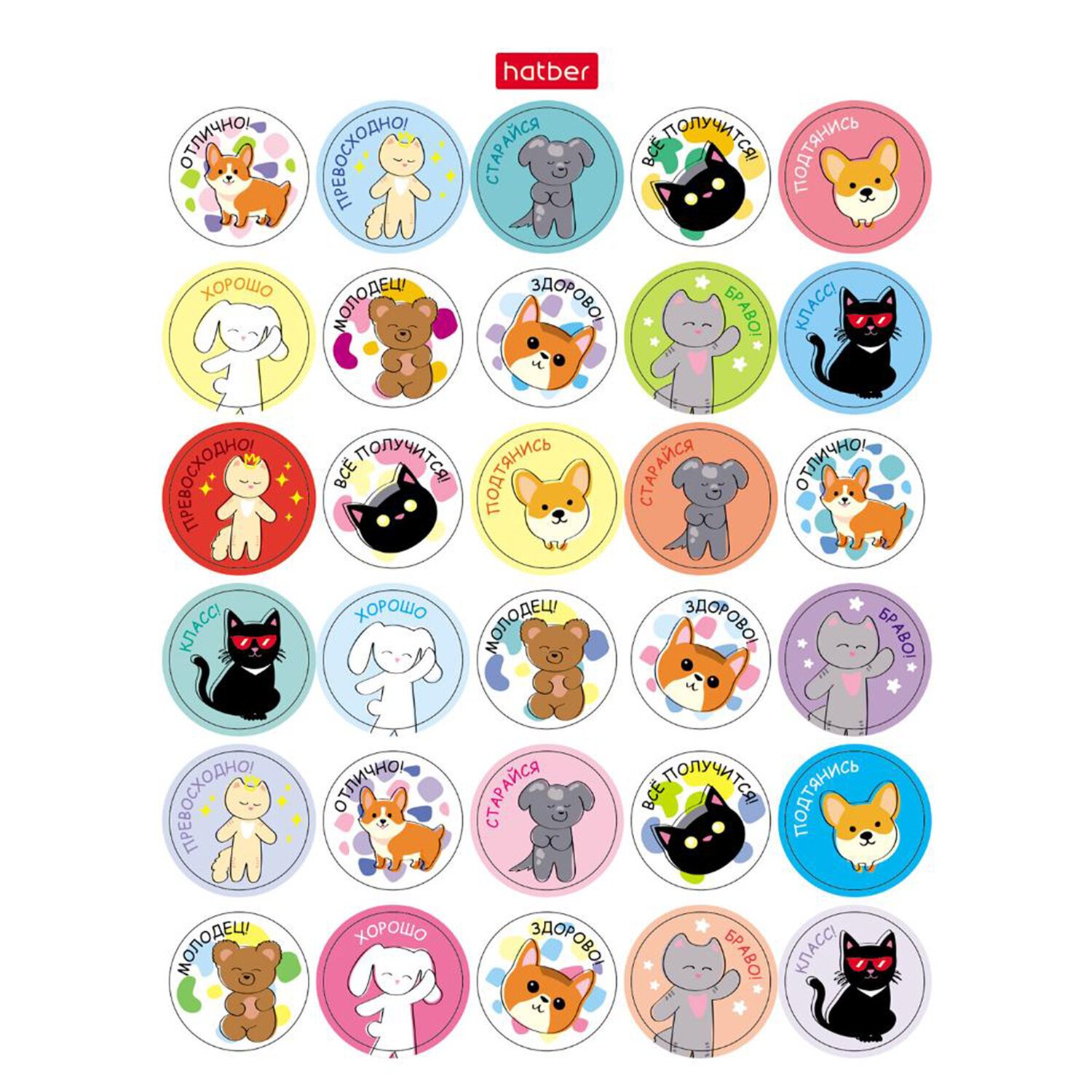 Наклейки бумажные поощрения и оценки, НАБОР 4листа, 115наклеек, Зверушки, HATBER,4Н6н