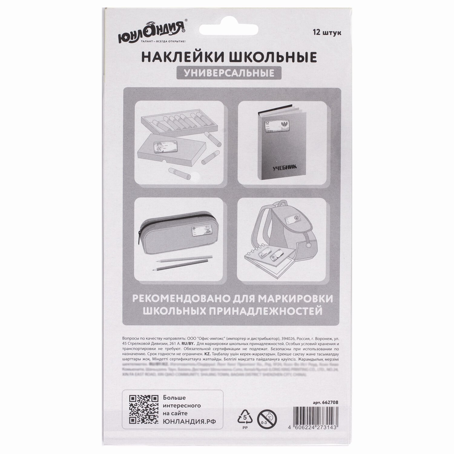 В наборе содержится 12 бумажных наклеек с объёмными элементами из мягкого пластика. На каждой наклейке предусмотрены линейки, на которых школьник может указать своё имя, фамилию и класс. Школьные наклейки - это не только удобный, но ещё и красивый способ индивидуализировать вещи ученика.