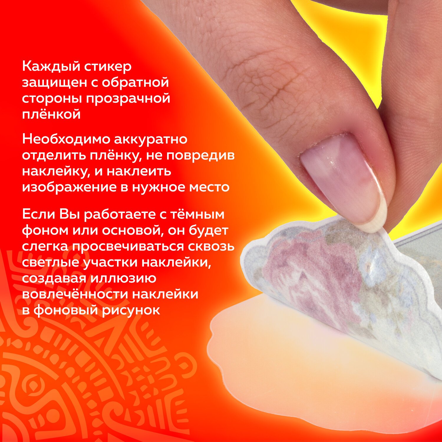 Каждый стикер защищен с обратной стороны прозрачной пленкой. Необходимо аккуратно отделить пленку, не повредив наклейку, и наклеить изображение в нужное место. Если вы работаете с темным фоном или основой, он будет слегка просвечиваться сквозь светлые участки наклейки, создавая иллюзию вовлеченности наклейки в фоновый рисунок.