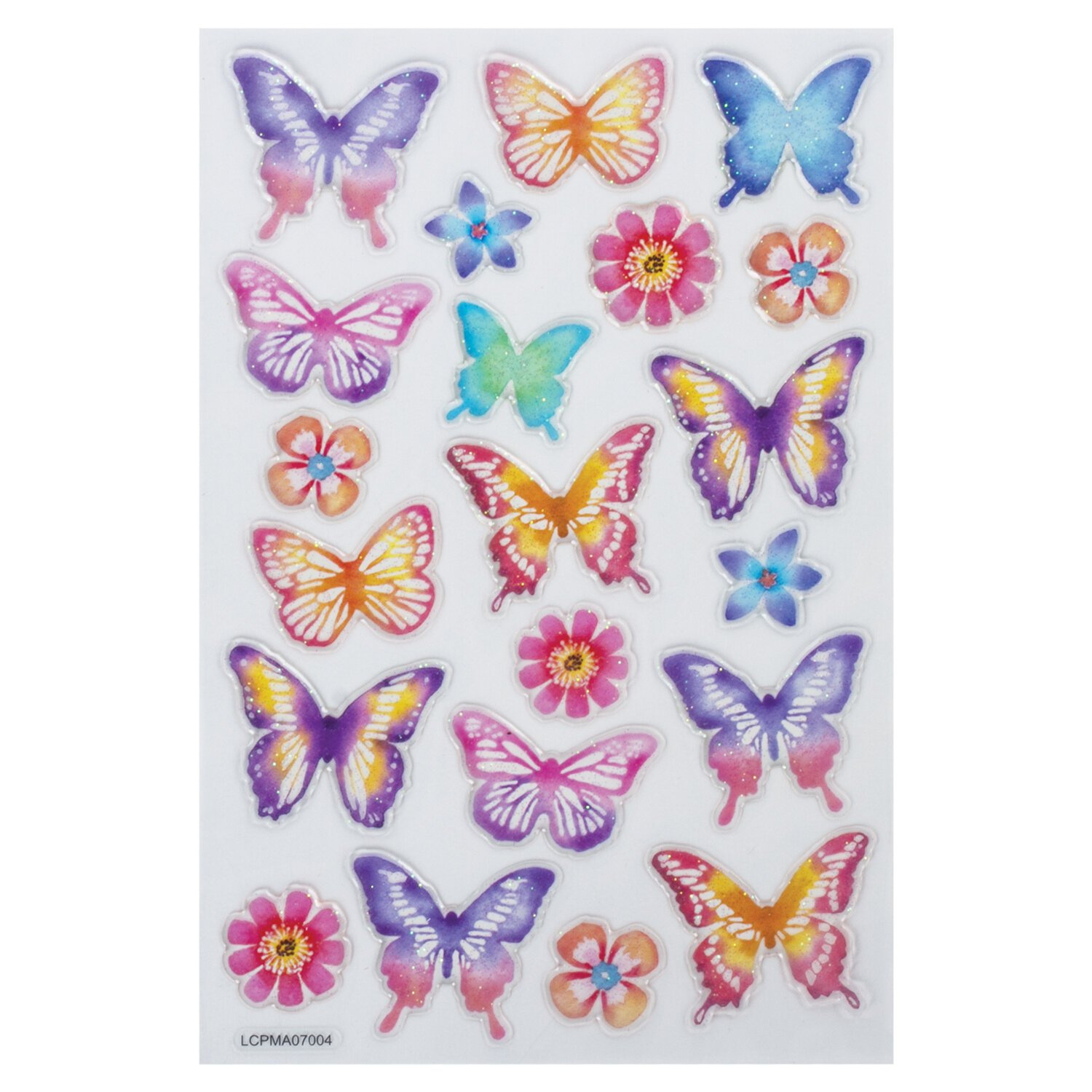 В наборе содержатся гелевые наклейки, украшенные блестками, в количестве 21 штуки. Наклейки отличаются высочайшим качеством печати и цветопередачи. Изящные бабочки и нежные цветы не оставят равнодушными маленьких принцесс, придадут оригинальности тетрадям, дневникам, гаджетам или нарядно украсят поделки.