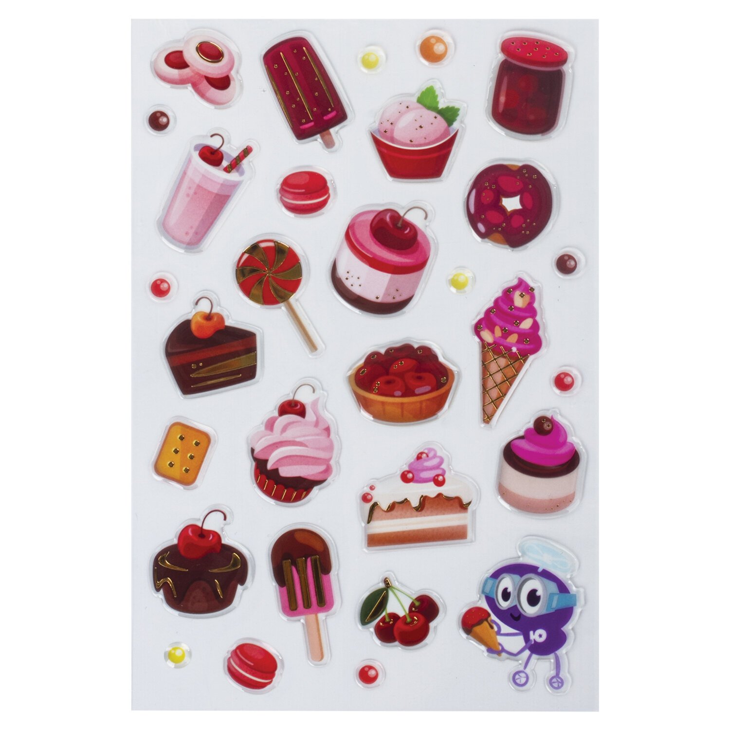 В наборе содержатся гелевые наклейки, украшенные фольгой, с изображением разных сладостей в количестве 30 штук. Наклейки отличаются высочайшим качеством печати и цветопередачи. Аппетитные кексы, пончики и мороженки украсят тетради, дневники, гаджеты и любые поделки.
