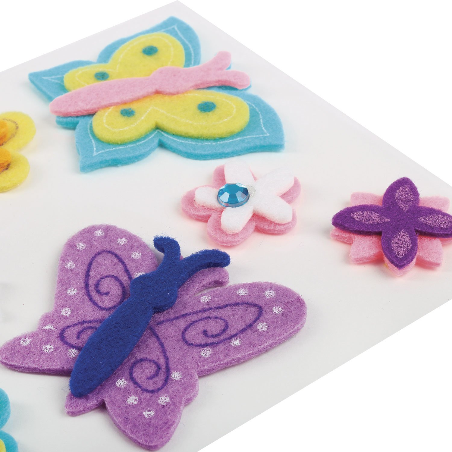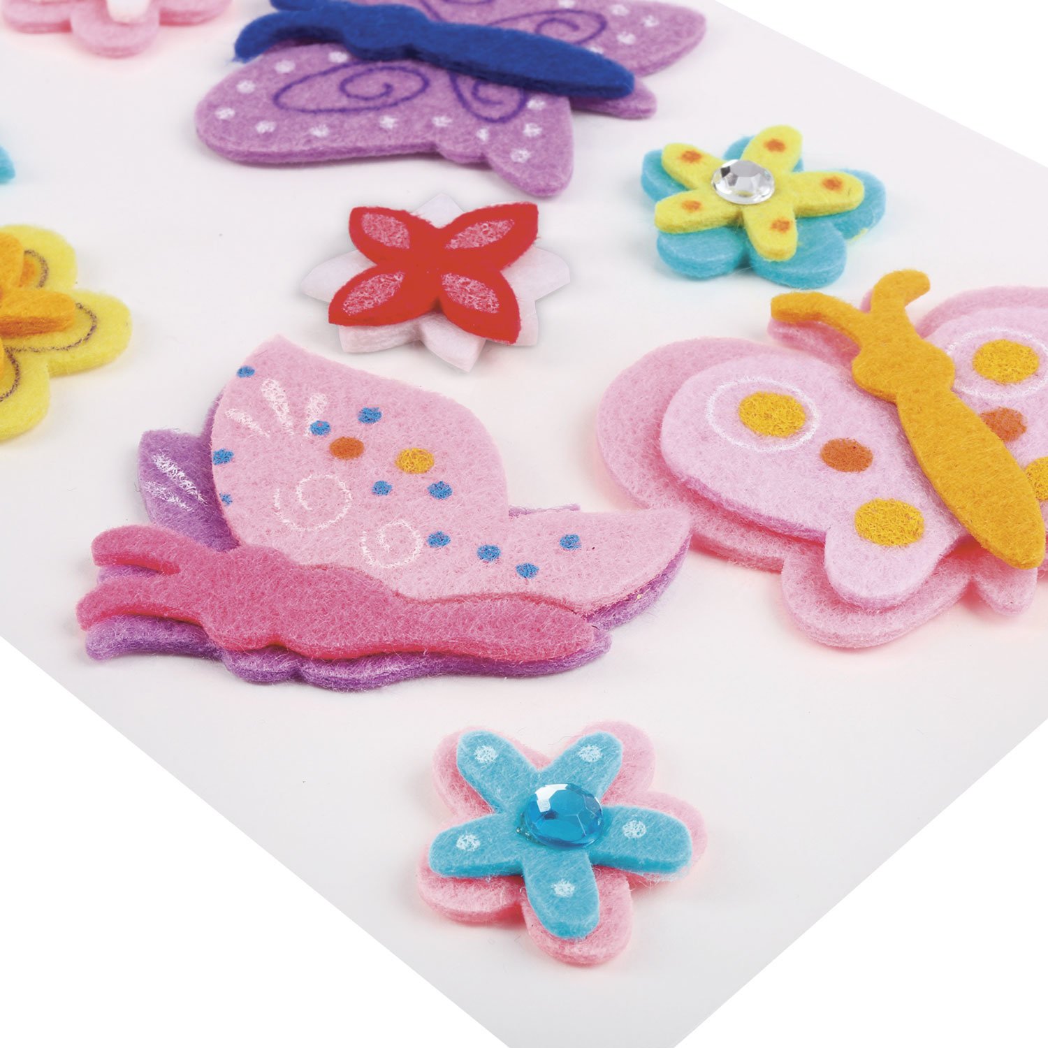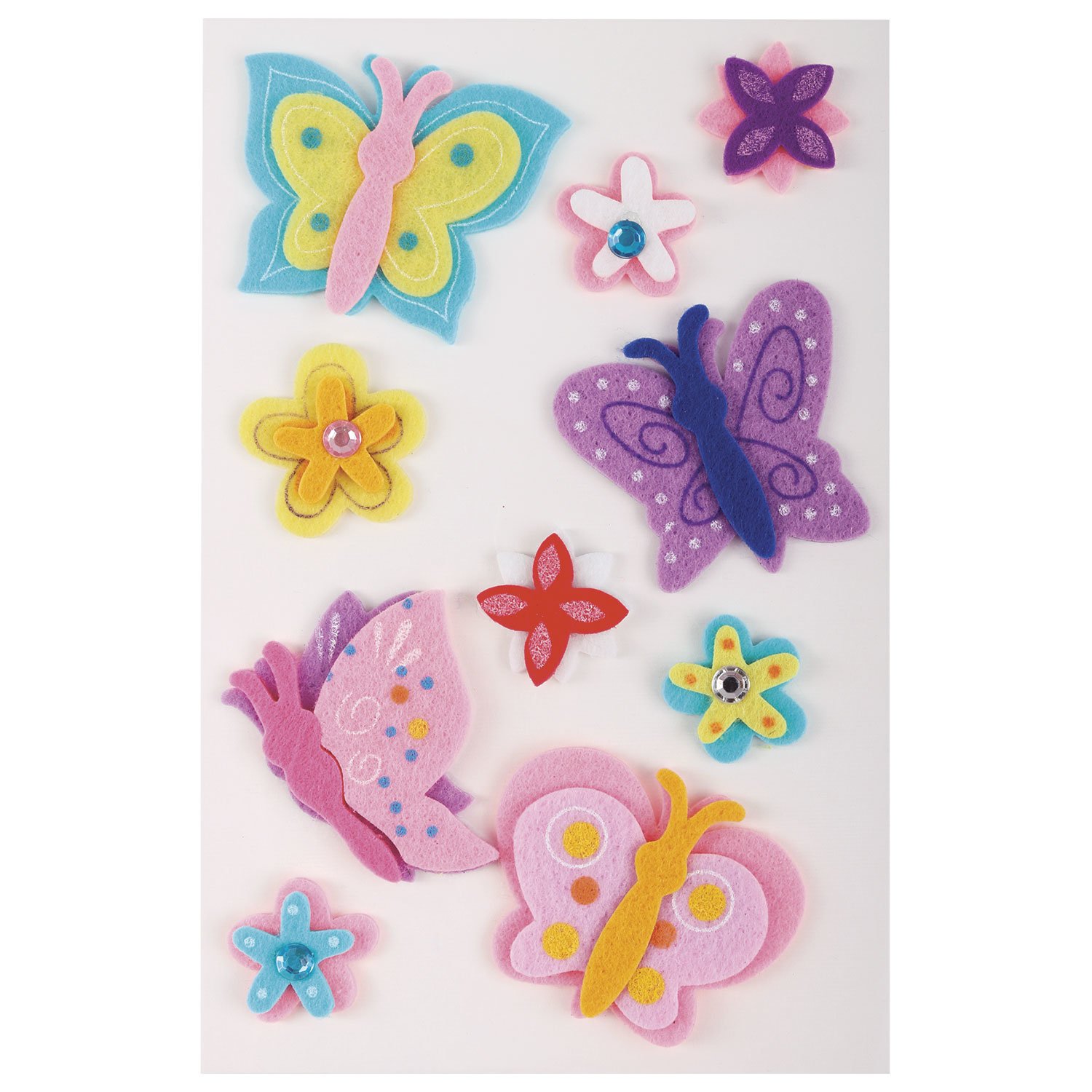 Изготовлены из фетра. В комплекте 10 красочных декоративных элементов в форме бабочек. Предназначены для детей от 3 лет. Поставляются в пакете с европодвесом с вкладышем размером 10х16 см. Качественный клеевой слой обеспечит надежную фиксацию на любых поверхностях.