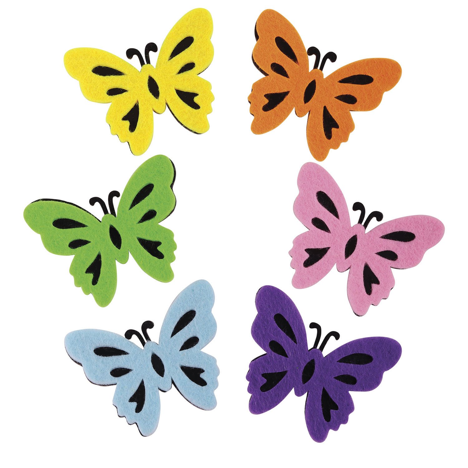 Изготовлены из фетра. В комплекте 6 красочных декоративных элементов в форме бабочек. Предназначены для детей от 3 лет. Размер 4х6 см. Поставляются в пакете с европодвесом. Качественный клеевой слой обеспечит надежную фиксацию на любых поверхностях.