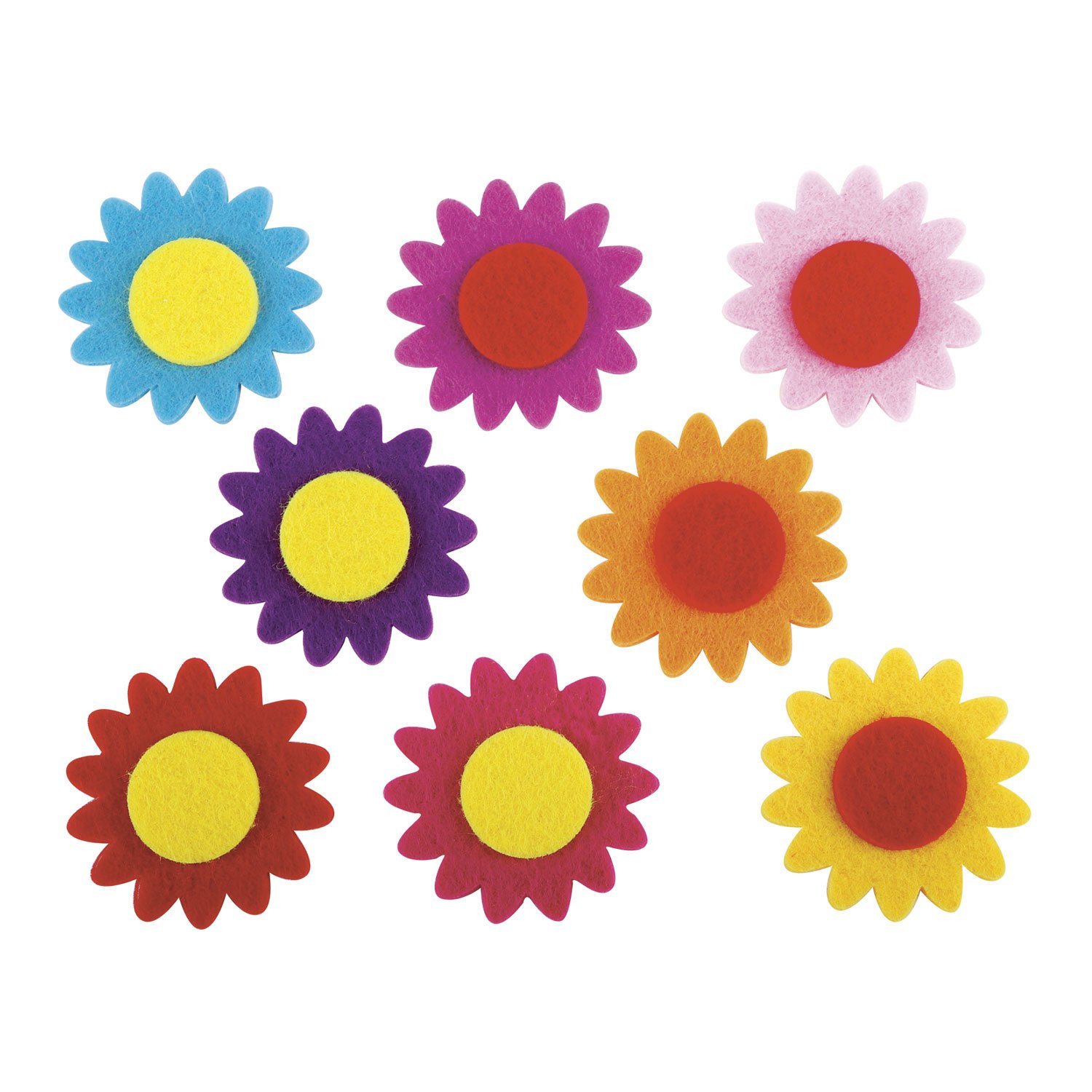 Изготовлены из фетра. В комплекте 8 красочных декоративных элементов в форме цветов. Предназначены для детей от 3 лет. Размер 5х5 см. Поставляются в пакете с европодвесом. Качественный клеевой слой обеспечит надежную фиксацию на любых поверхностях.