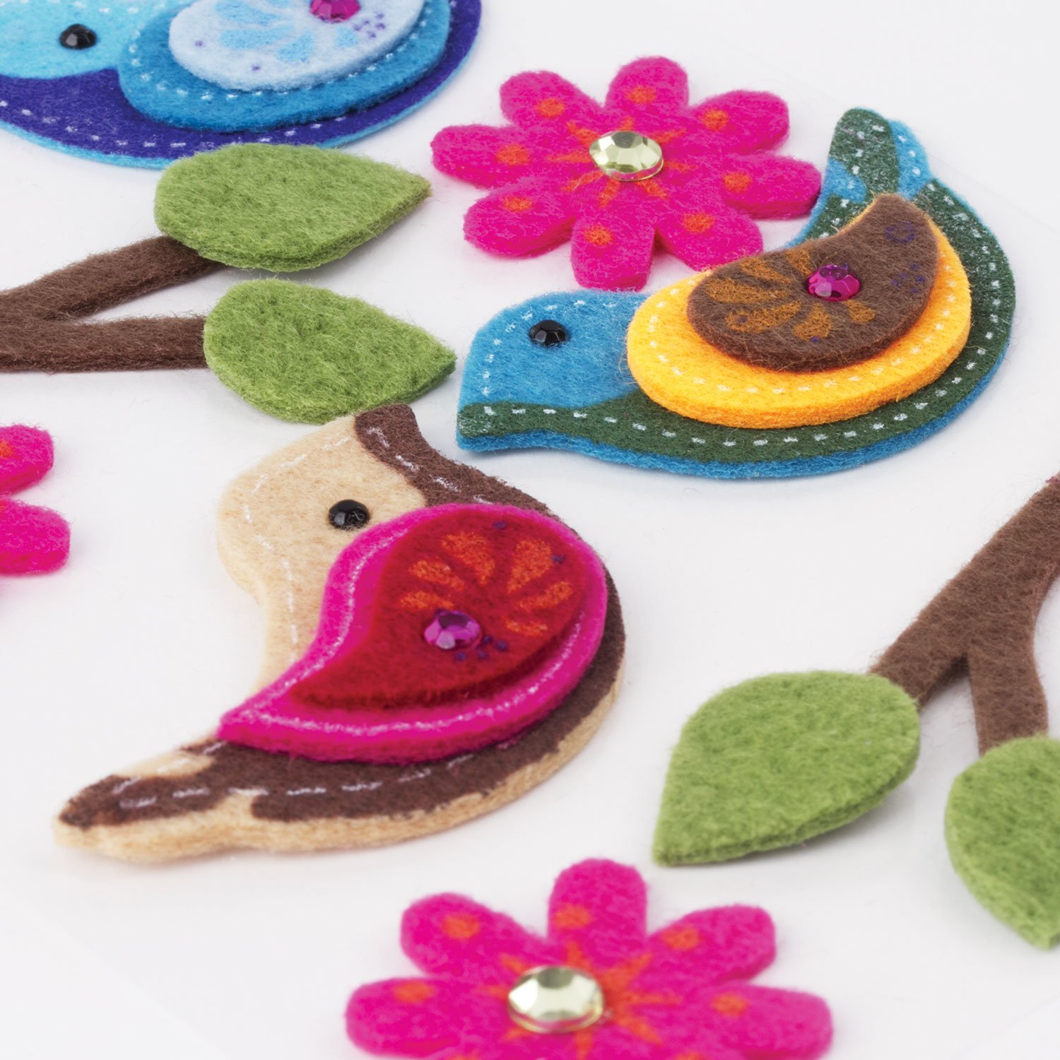 Изготовлены из фетра. В комплекте 11 красочных декоративных элементов в форме птичек. Предназначены для детей от 3 лет. Поставляются в пакете с европодвесом с вкладышем размером 10х16 см. Качественный клеевой слой обеспечит надежную фиксацию на любых поверхностях.