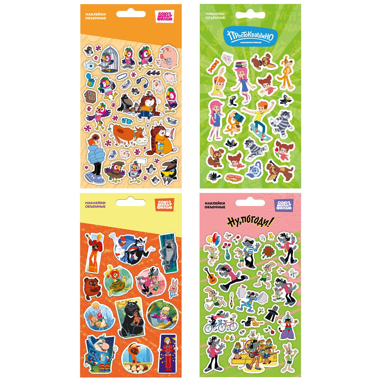 Наклейки объемные многоразовые с героями мультипликационных фильмов киностудии СОЮЗМУЛЬТФИЛЬМ - Попугай Кеша, Трое из Простоквашино, Ну,погоди!, Маугли, Котенок Гав, Как львенок и Черепаха пели песню и др. Яркие наклейки на телефон, тетради, папки, рюкзак