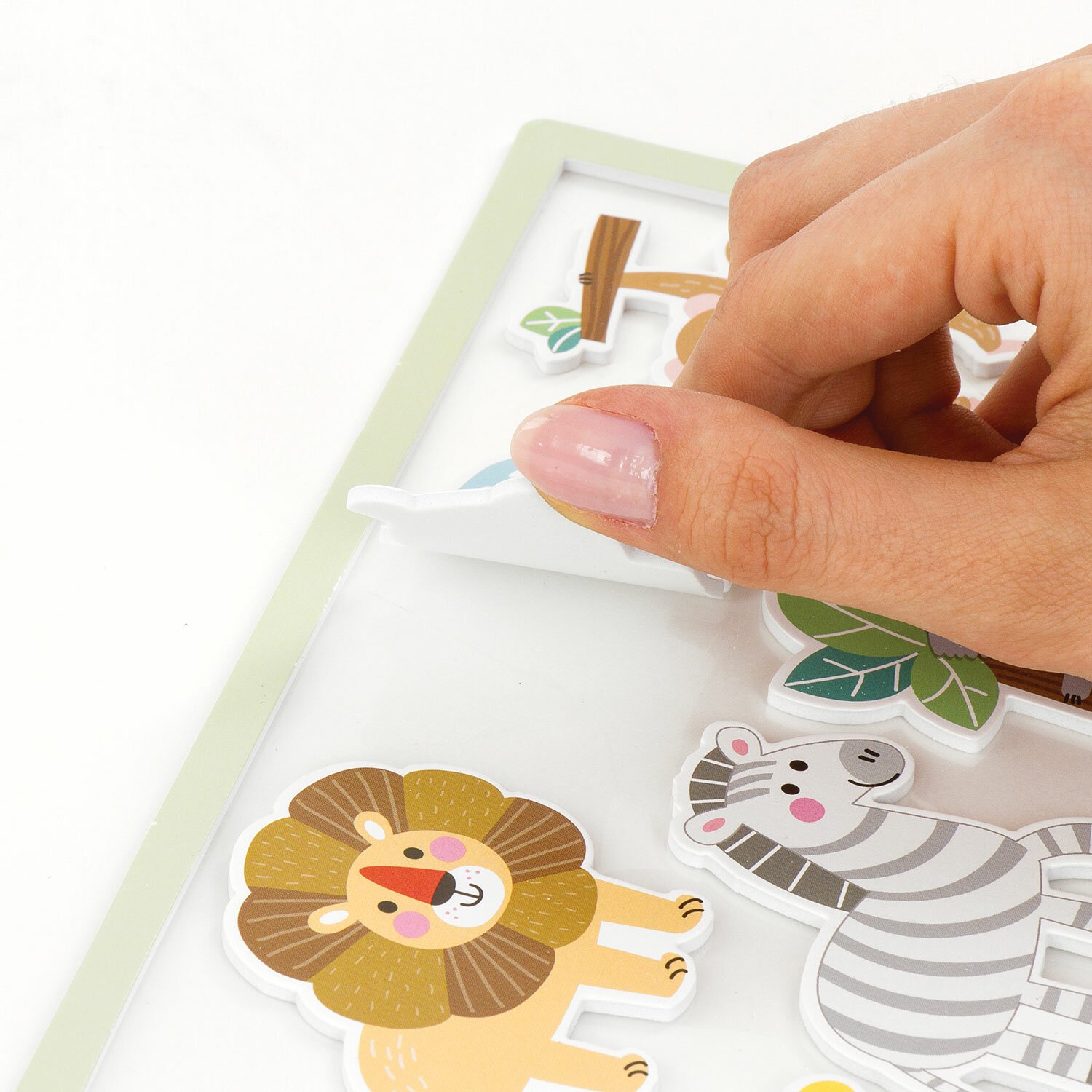 В набор входит 12 крупных объемных наклеек в виде различных животных Африки, а также картонное поле размером 20*40 см (поставляется в сложенном виде) с определенными местами для нанесения наклеек. Место для каждой наклейки на поле подписано соответствующим образом, например, лев, жираф, зебра и т.д. Таким образом, в ходе игры ребенок знакомится с названием и внешним видом животного.