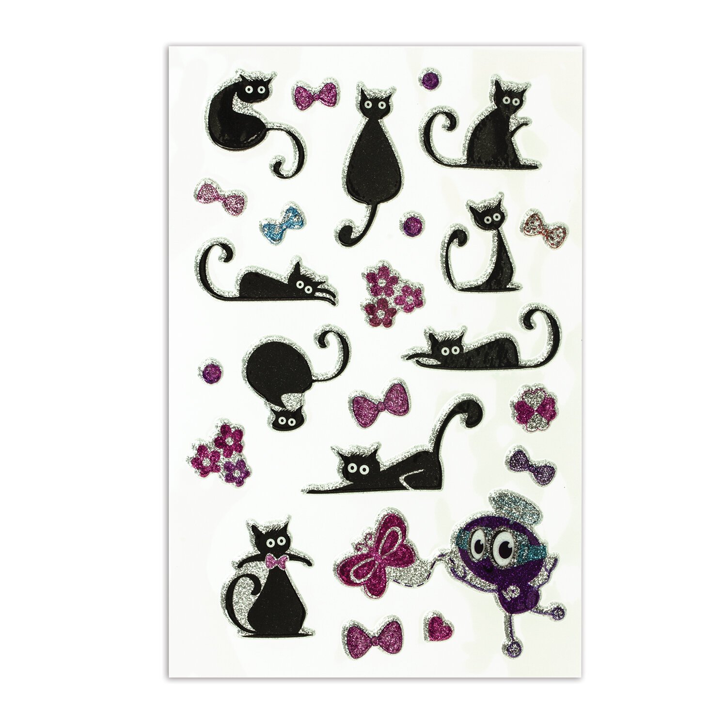 В наборе содержатся блестящие зефирные наклейки с изображением кошек и украшений в количестве 24 штук. Наклейки отличаются высочайшим качеством печати и цветопередачи. Мягкие наклейки с забавными чёрными кошками придадут оригинальности тетрадям, дневникам, гаджетам и помогут украсить любую поделку.