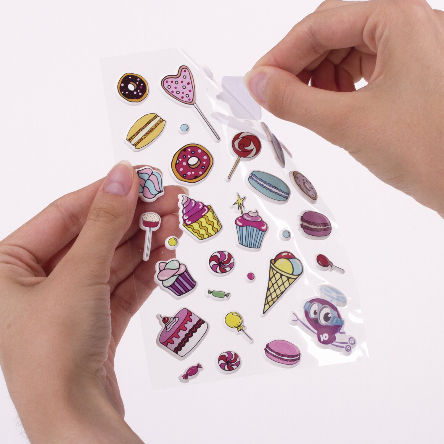 В наборе содержатся мягкие зефирные наклейки с изображением разнообразных сладостей в количестве 33 штук. Наклейки отличаются высочайшим качеством печати и цветопередачи. Яркие торты, кексы, пончики и леденцы будут аппетитно выглядеть на тетрадях, дневниках, гаджетах и оригинально украсят любую поделку.
