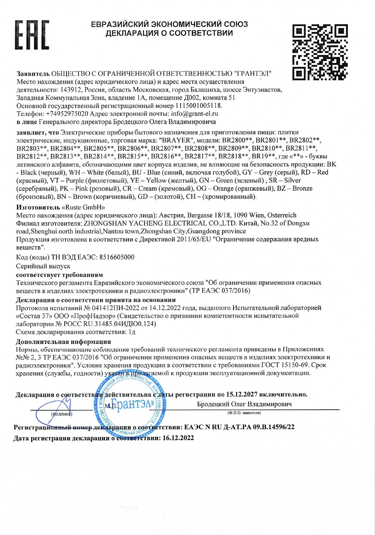 Настольная индукционная плита BRAYER BR2801, 2000 Вт, 5 программ, сенсорное управление, черная
