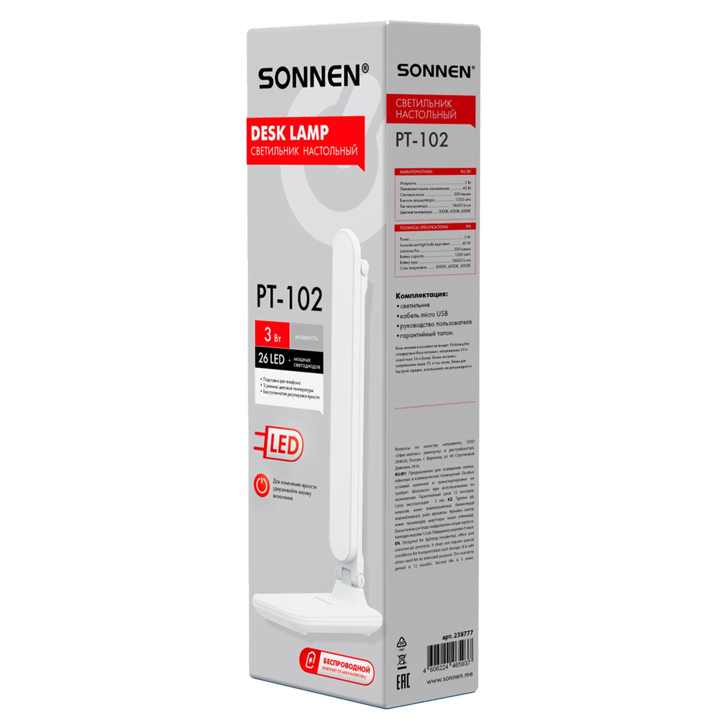 Настольная лампа светильник беспроводная SONNEN PT-102, USB, LED, 3 Вт, 3 режима, белый, 238777