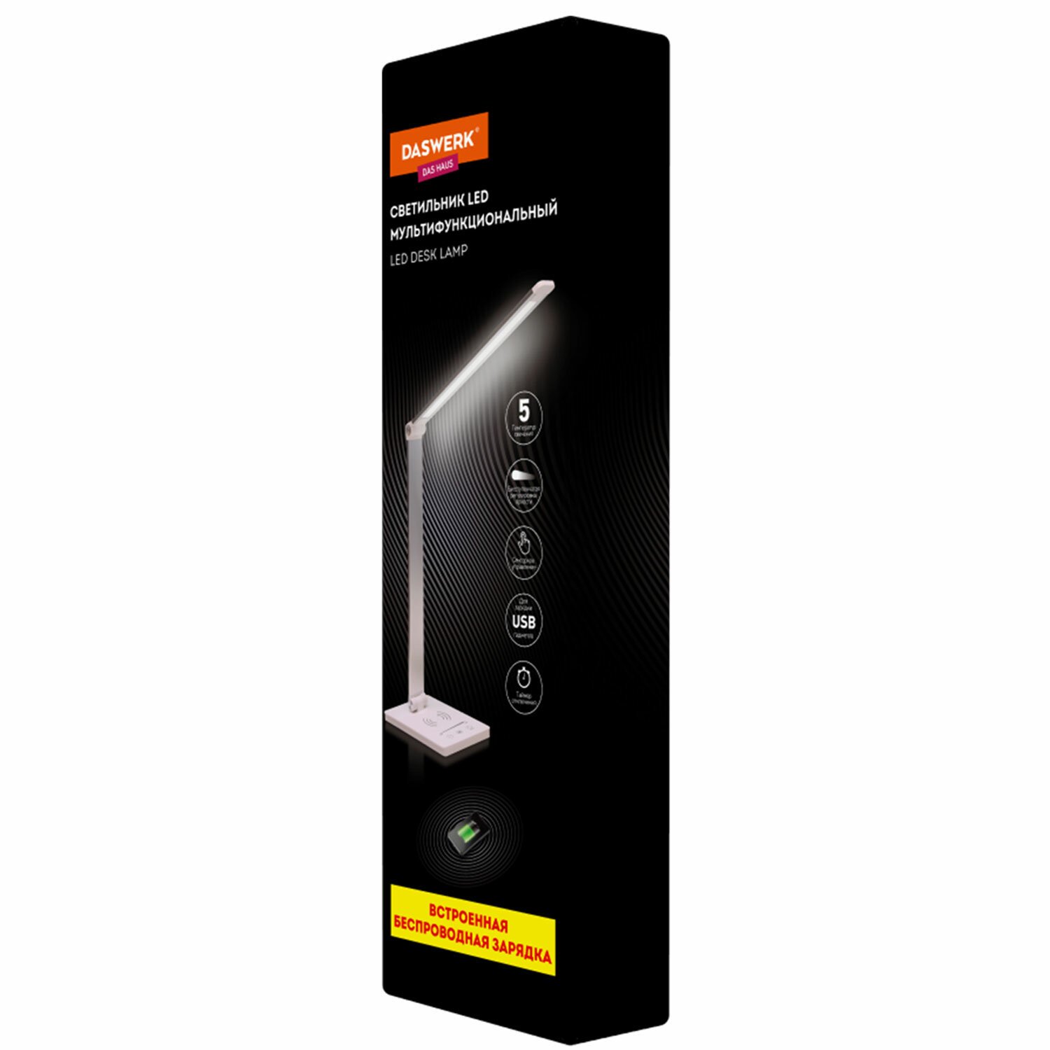 Многофункциональный светильник DASWERK является незаменимым атрибутом рабочего места. Светильник оборудован дополнительными функциями: беспроводной зарядкой и таймером отключения. Прекрасно подойдет для школьника, студента, офисного менеджера.