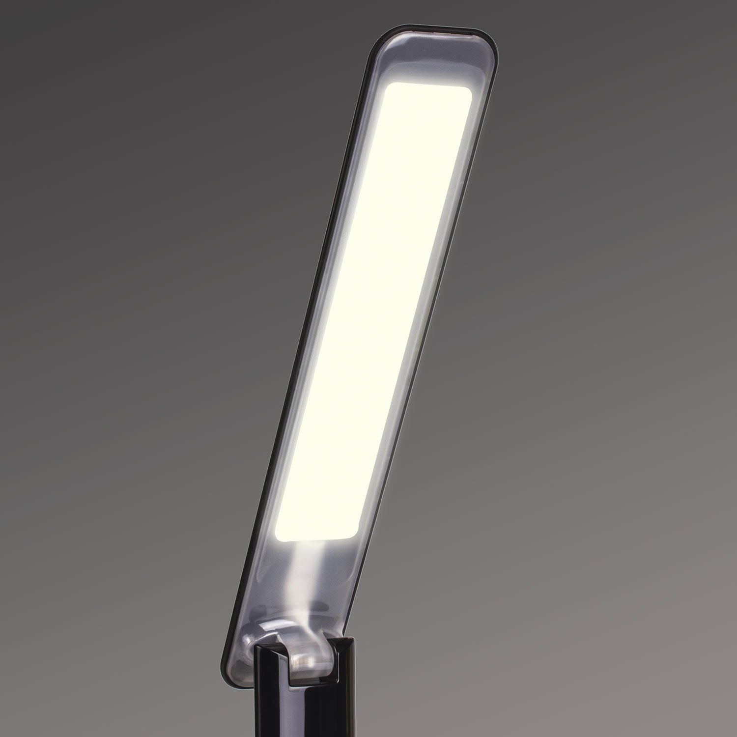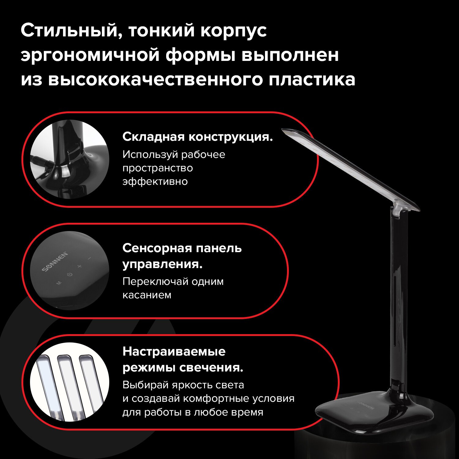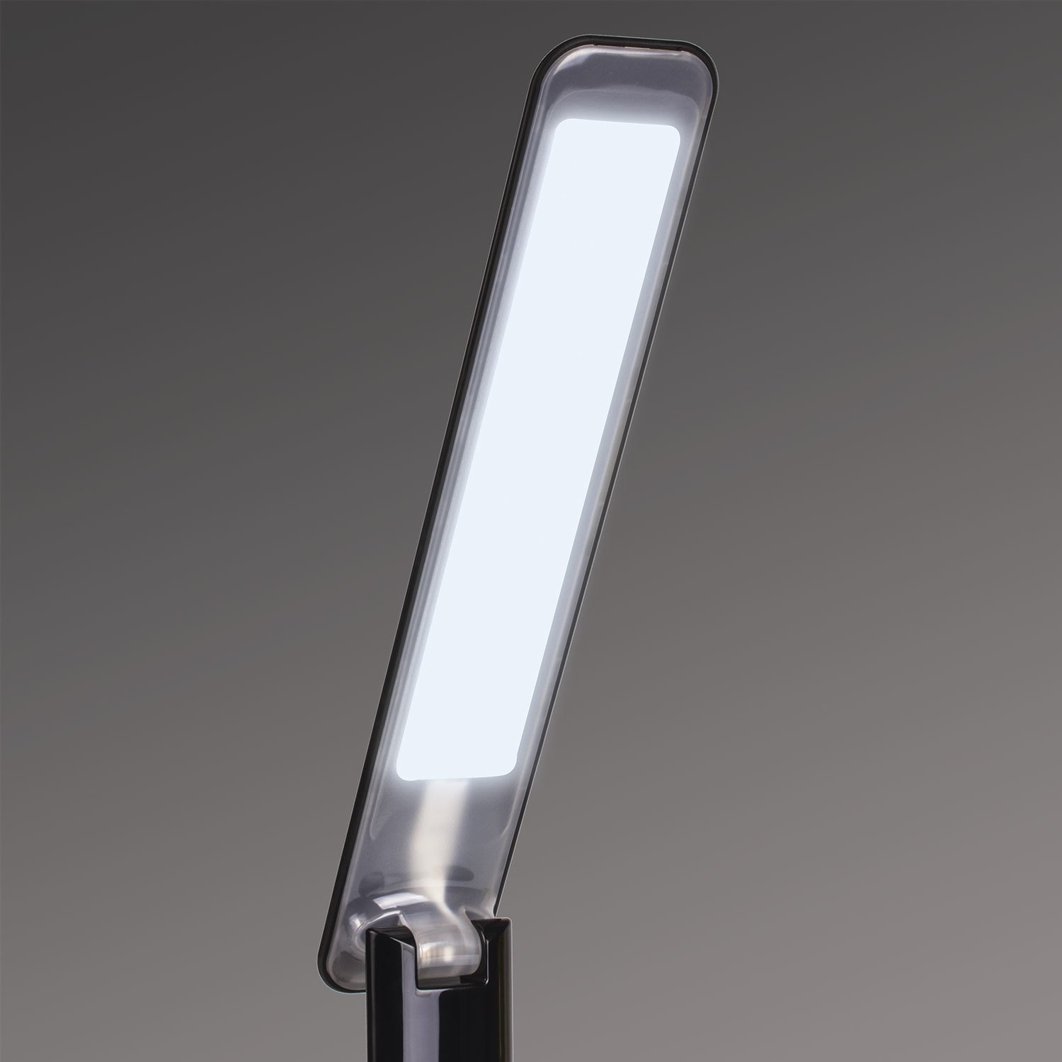 Настольный светильник высотой 33 см представлен в классическом черном дизайне, благодаря которому гармонично впишется в офисный или домашний интерьер. Устройство оснащено легким пластиковым корпусом и яркой LED матрицей на 8 Вт. Вы будете довольны освещением с цветовой температурой от 2700 до 6000 K и световым потоком 350 Лм, которое обеспечивают 14 светодиодов. Прибор оснащен сенсорным выключателем. Благодаря 3 режимам свечения можно самостоятельно выбрать яркость света.