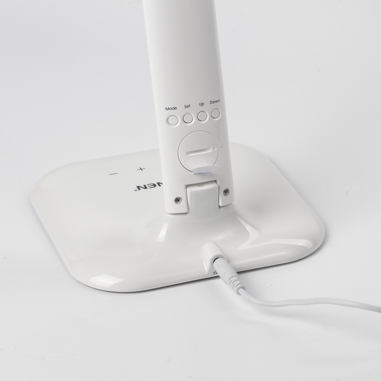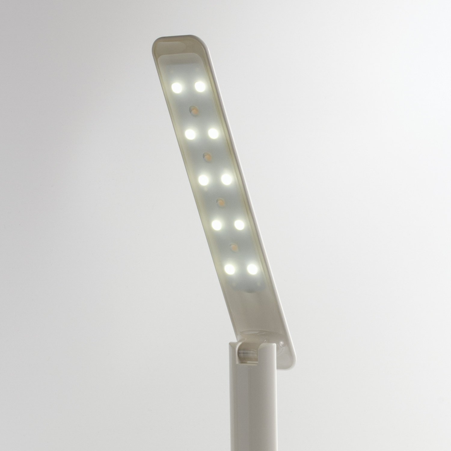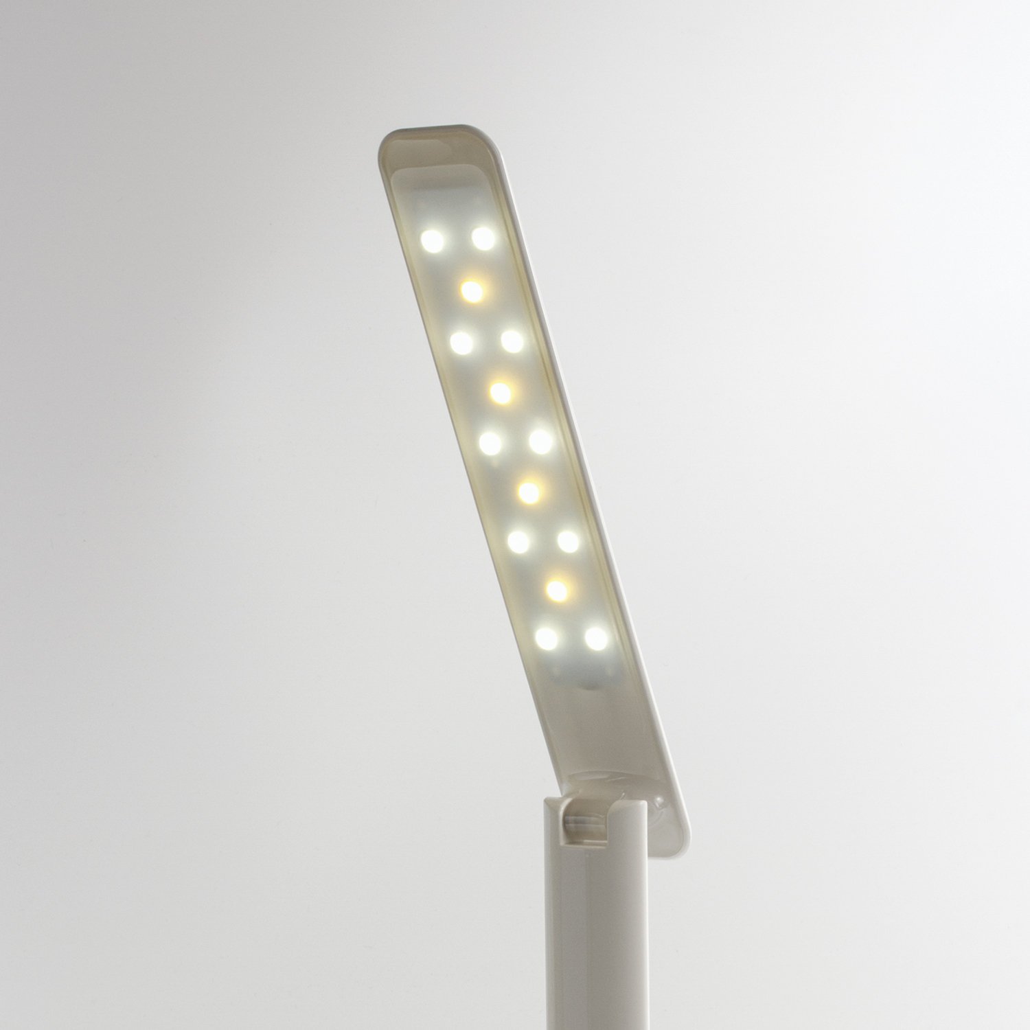Лампа обладает высотой 33 см и представлена в классическом белом дизайне, благодаря которому гармонично впишется в офисный или домашний интерьер. Устройство оснащено легким пластиковым корпусом и яркой LED-матрицей на 9 Вт. Освещение с цветовой температурой от 2700 до 6000 K и световым потоком 350 Лм обеспечивают 14 светодиодов. Прибор оснащен сенсорным выключателем. Благодаря 3 режимам свечения можно самостоятельно выбрать яркость света, режимы переключаются однократным нажатием на кнопку М на панели светильника.