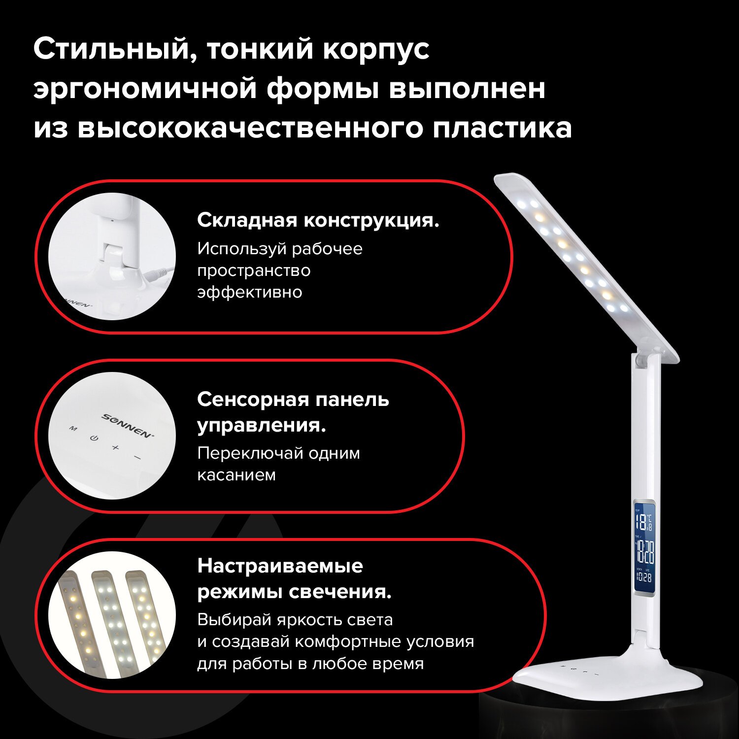 Настольная лампа-светильник SONNEN SM-01W на подставке, LCD-экран, СВЕТОДИОДНАЯ, 5 Вт, белый, 238233