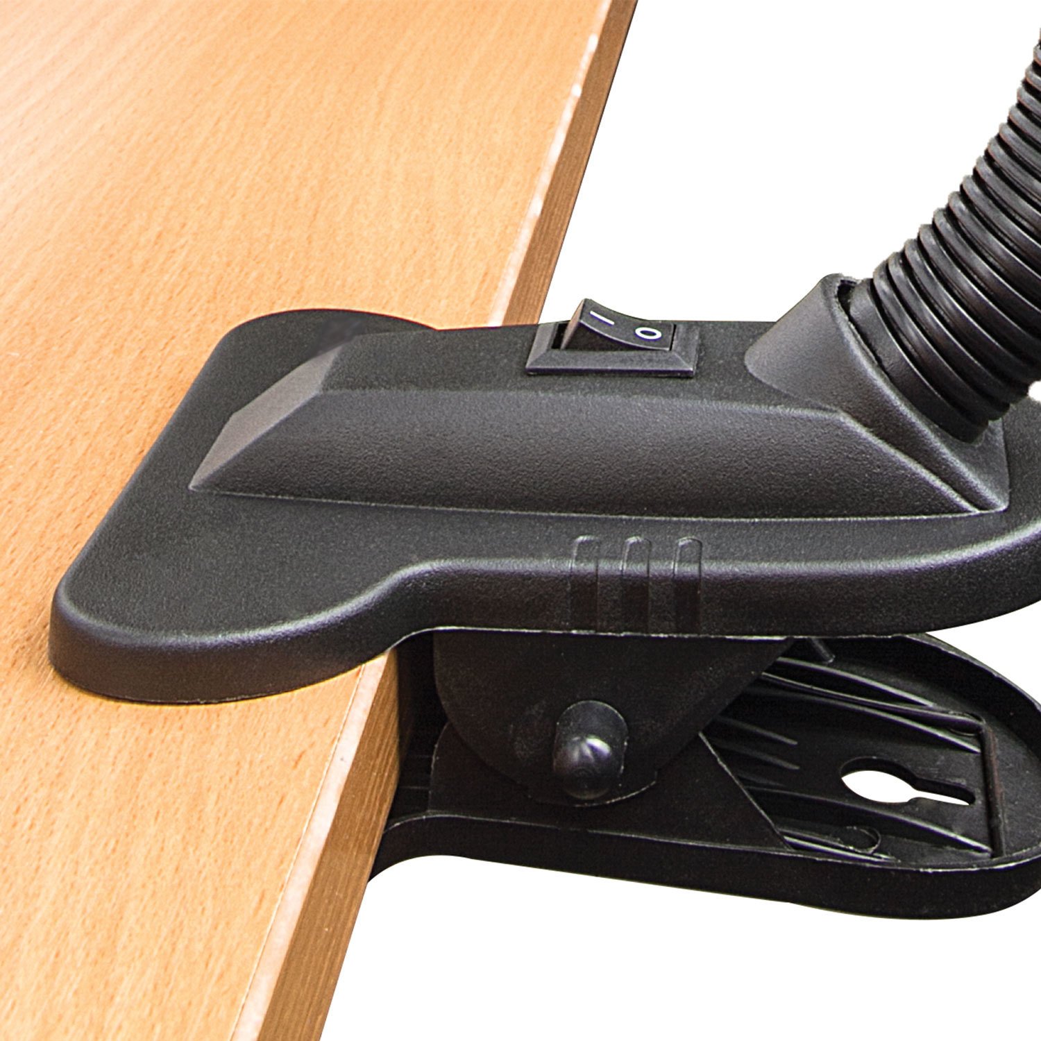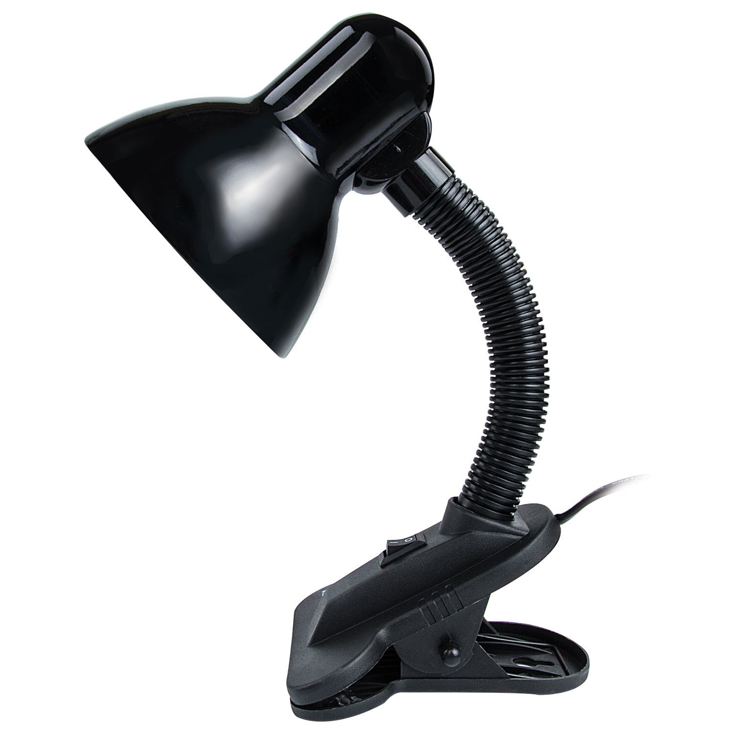 Для светильника высотой 30 см подходит любая технология бытовых ламп (накаливания, люминисцентная, светодиодная) с цоколем Е27, благодаря чему можно самостоятельно выбрать яркость и оттенок света. При использовании лампы накаливания, максимальная мощность не должна превышать 40 Вт. Корпус из пластика представлен в предельно простом черном дизайне, благодаря которому он гармонично впишется в офисный или домашний интерьер. Лампа крепиться с помощью прищепки.