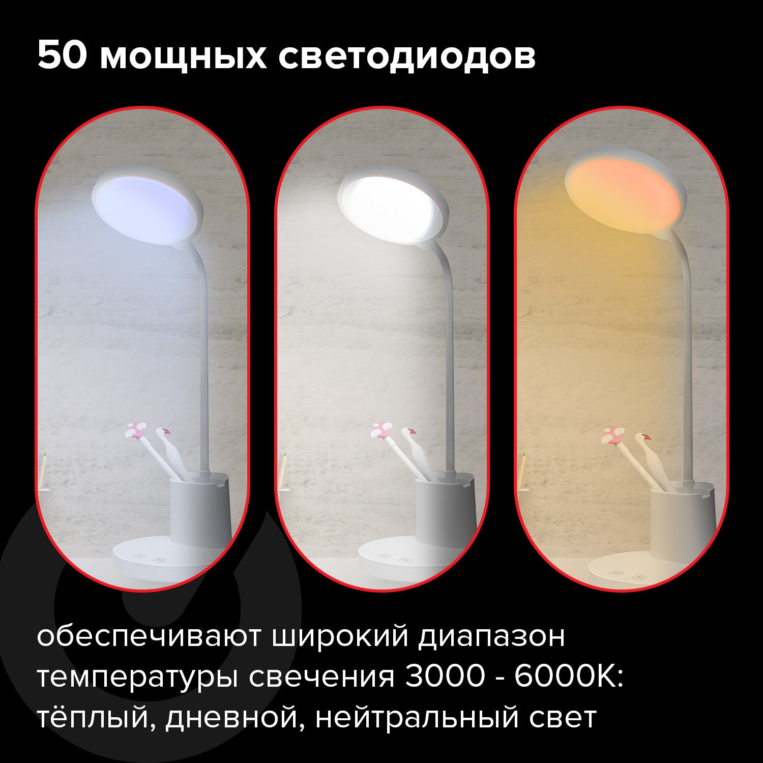 Настольный светильник высотой 43 см представлен в лаконичном белом дизайне, благодаря которому гармонично впишется в офисный или домашний интерьер. Устройство оснащено легким пластиковым корпусом и яркой LED-матрицей на 10 Вт. Вы будете довольны освещением с цветовой температурой от 3000 до 6000 K и световым потоком 300 Лм, который обеспечивают 50 светодиодов. Светильник оснащен сенсорной кнопкой включения. Благодаря 3 режимам свечения можно самостоятельно выбрать яркость света.