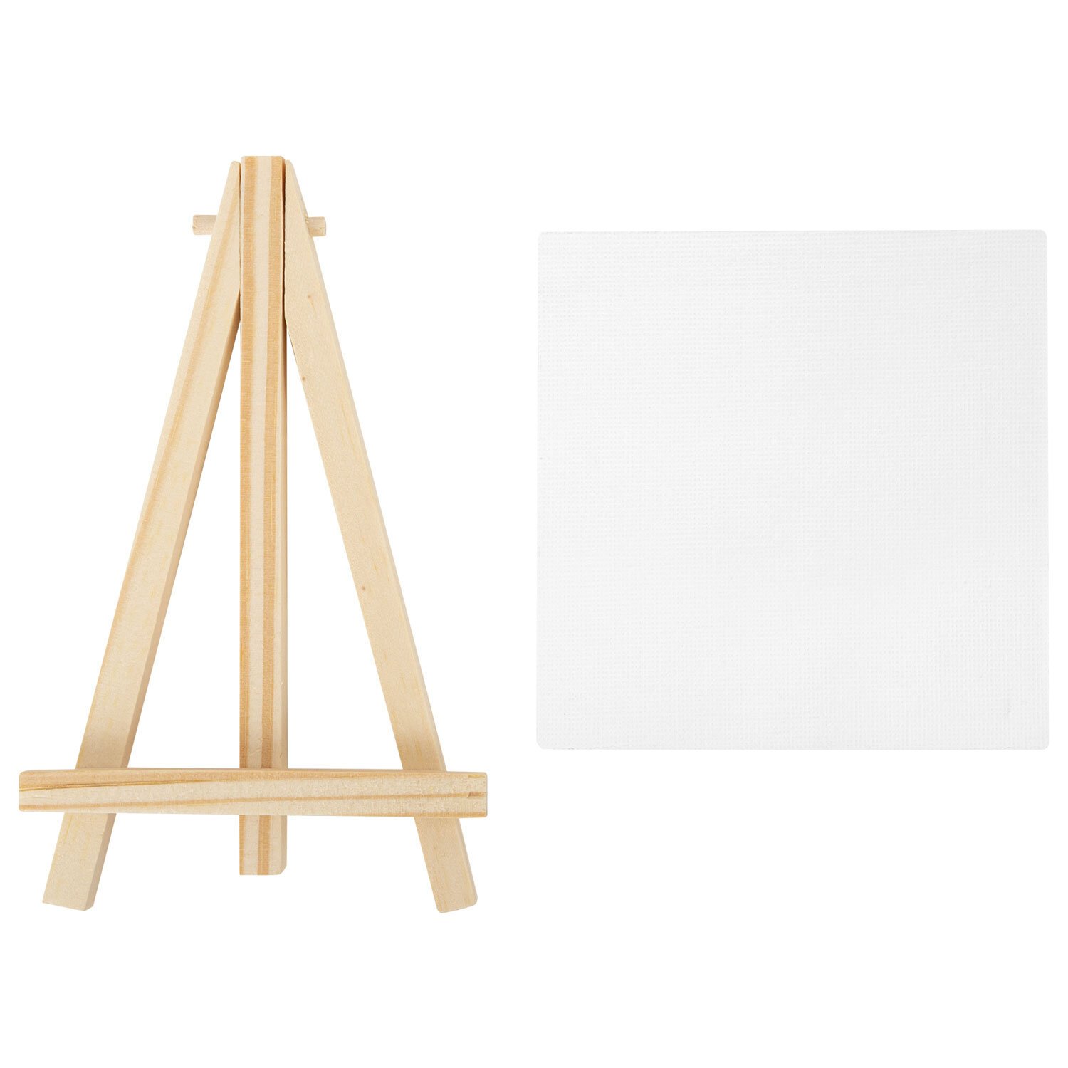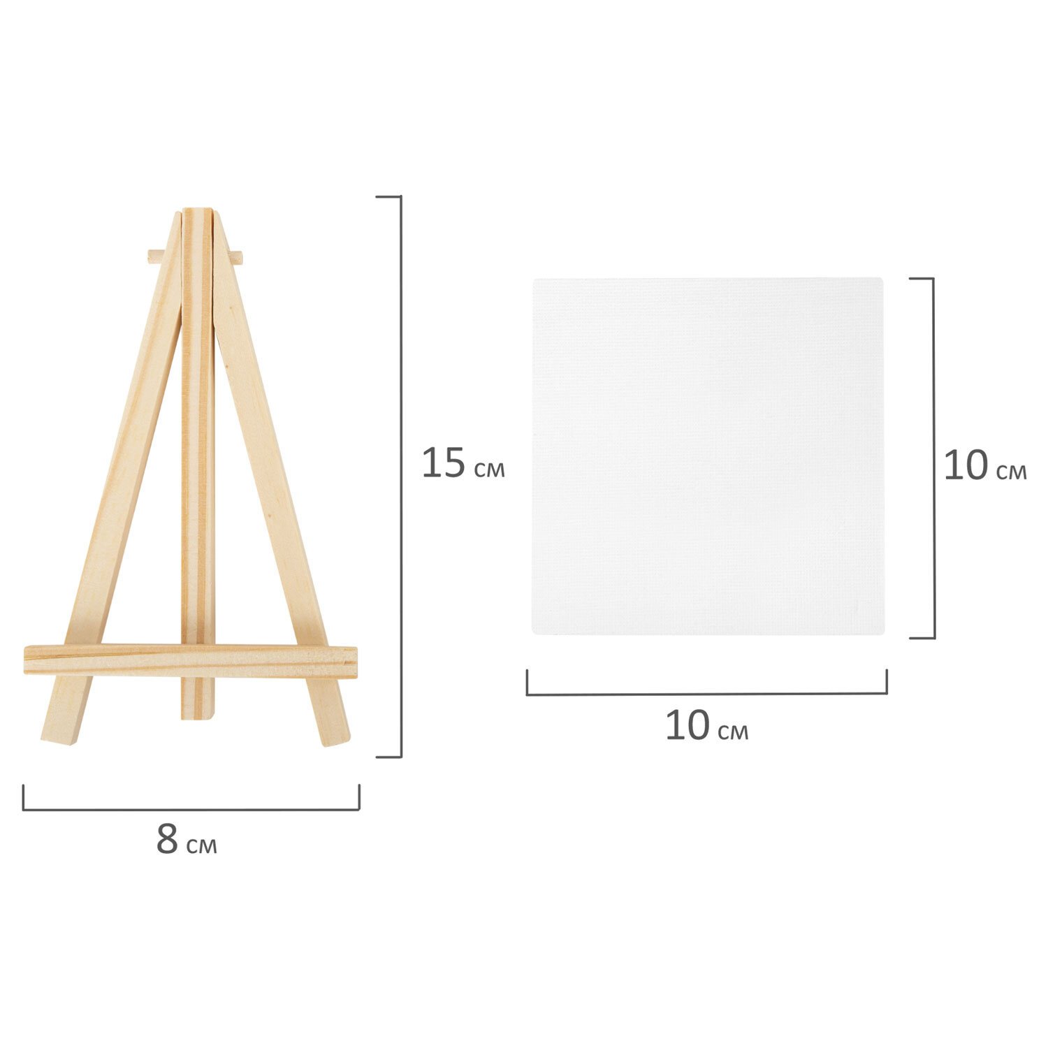 Размер мольберта - 15х8 см. Размер холста - 10х10 см. Набор упакован в термоусадку.