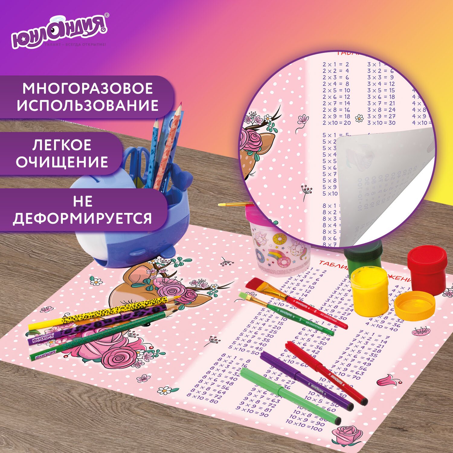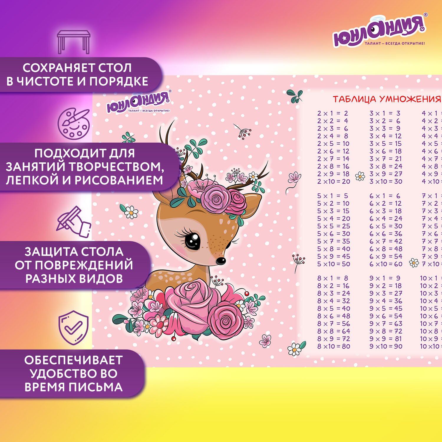 Настольное покрытие ЮНЛАНДИЯ "Fawn" сохранит стол в чистоте и порядке, отлично подойдет для занятий творчеством, лепкой и рисованием. Обеспечит удобство во время письма. Является хорошей защитой для стола от разного рода повреждений.