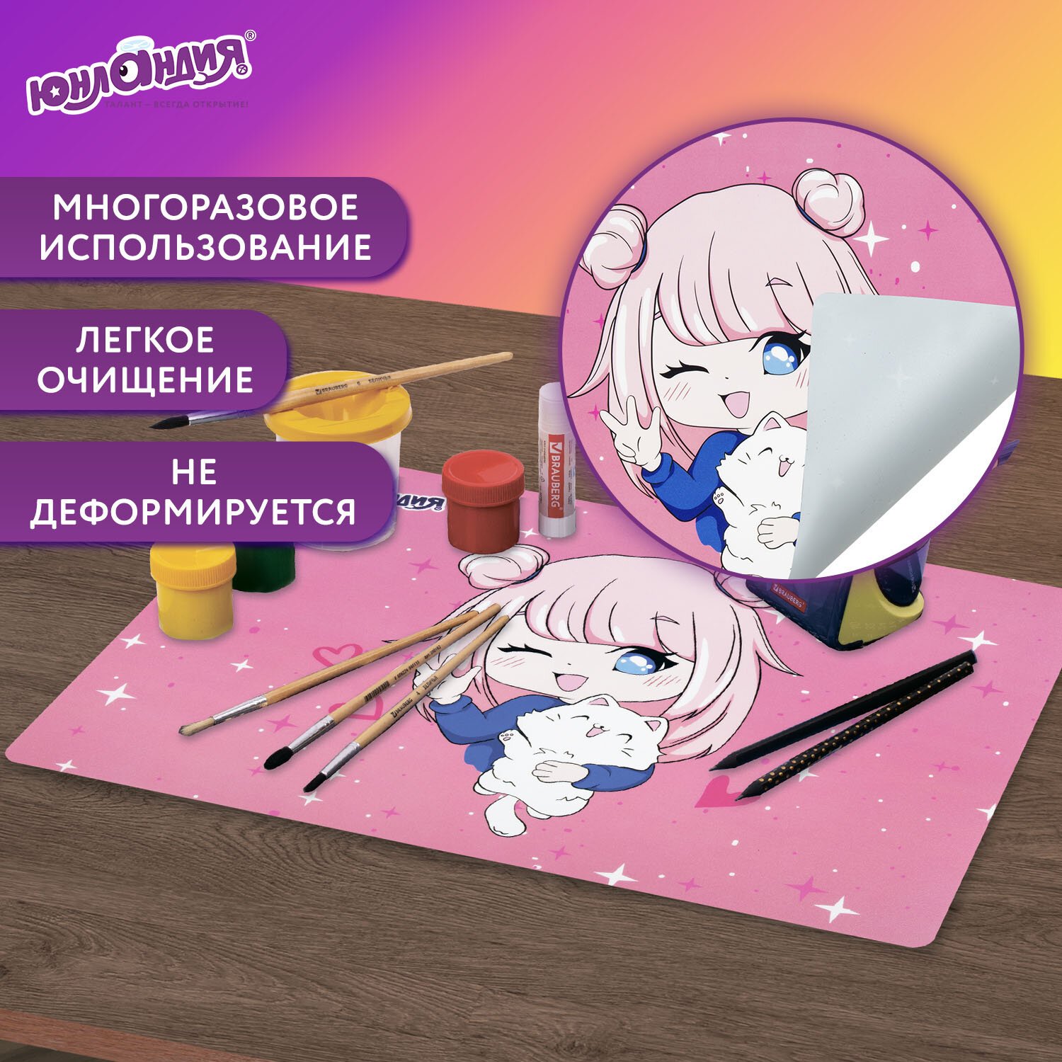 Настольное покрытие ЮНЛАНДИЯ "Anime pals" сохранит стол в чистоте и порядке, отлично подойдет для занятий творчеством, лепкой и рисованием. Обеспечит удобство во время письма. Является хорошей защитой для стола от разного рода повреждений.
