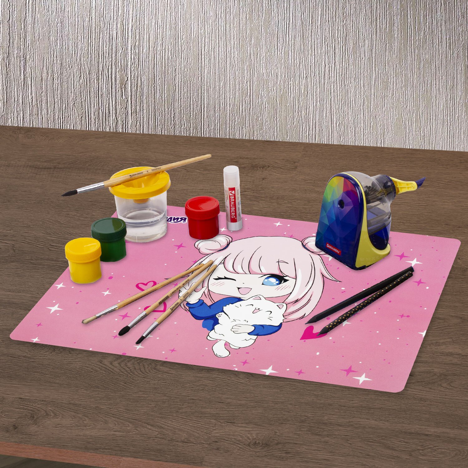 Настольное покрытие не съезжает и не деформируется при работе. Практичная прямоугольная форма и стандартный размер 33х23 см позволяют закрыть практически всю необходимую рабочую поверхность. Благодаря компактному размеру настольное покрытие можно брать с собой в школу и на дополнительные творческие занятия.