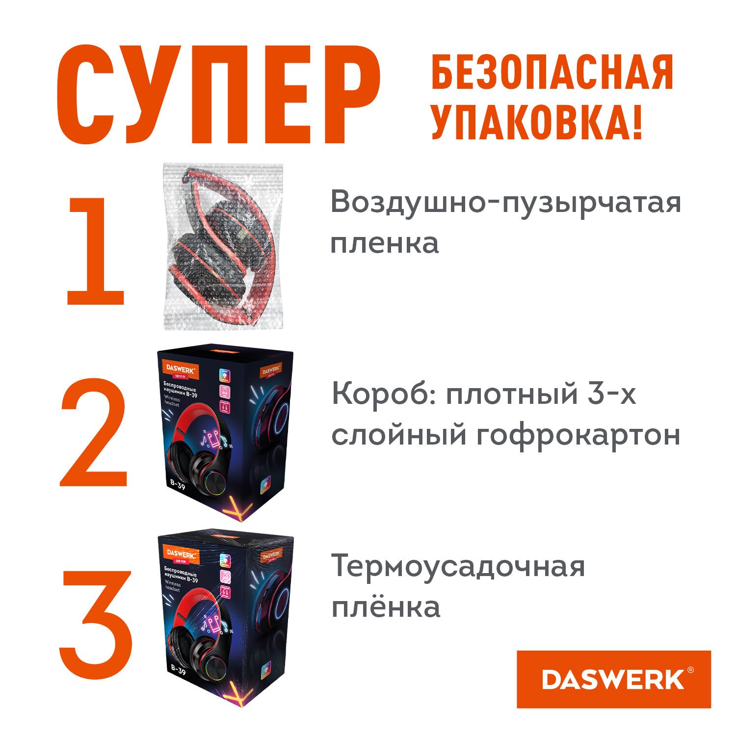 Беспроводные наушники DASWERK с подсветкой - это яркая и надёжная гарнитура. Слушай музыку, аудиокниги, играй!