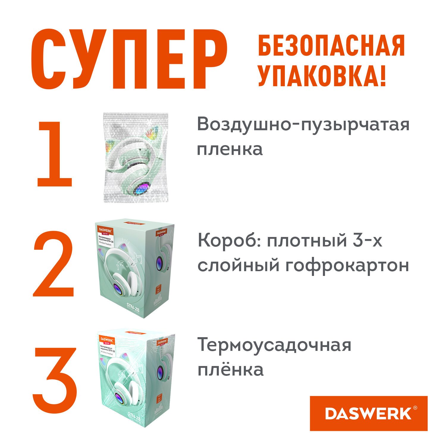 Упакованы в прочный цветной картонный короб привлекательного дизайна, поэтому беспроводные наушники DASWERK подойдут в качестве подарка друзьям, близким, детям.