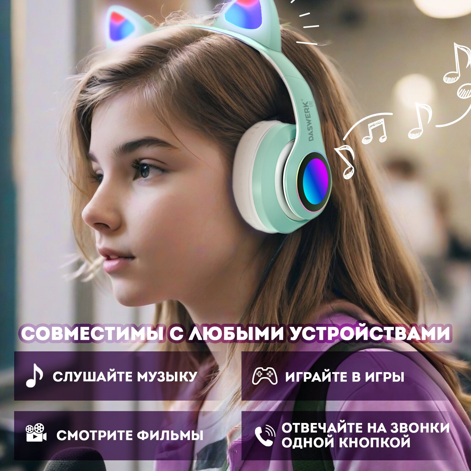 Беспроводные наушники DASWERK с кошачьими ушками и подсветкой - это яркая и надёжная гарнитура. Слушай музыку, аудиокниги, играй!