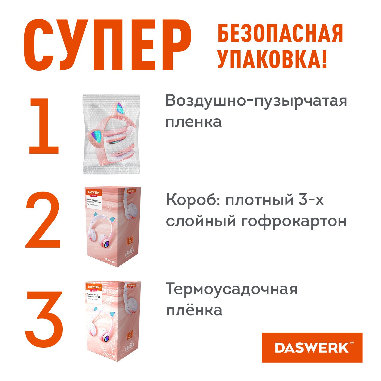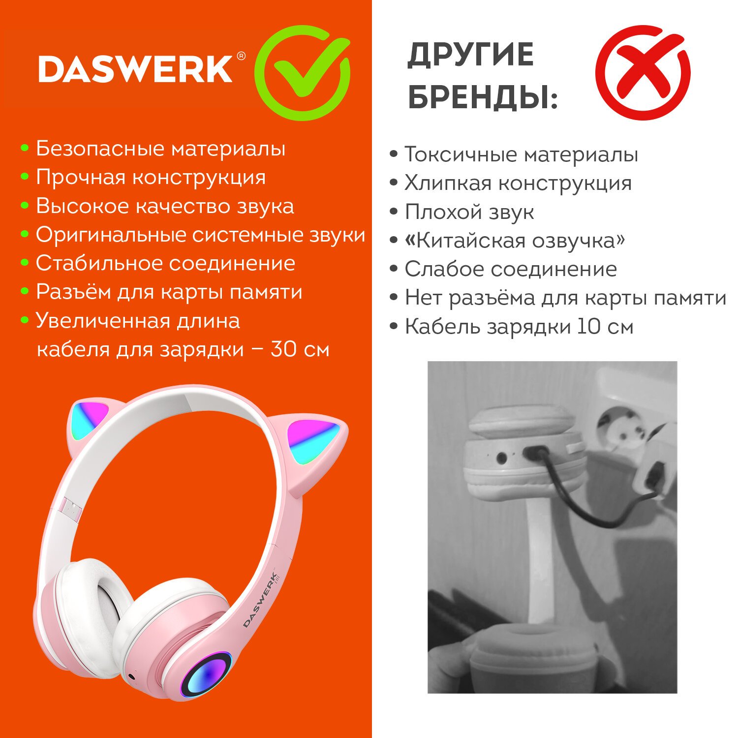 Беспроводные наушники DASWERK с кошачьими ушками и подсветкой - это яркая и надёжная гарнитура. Слушай музыку, аудиокниги, играй!