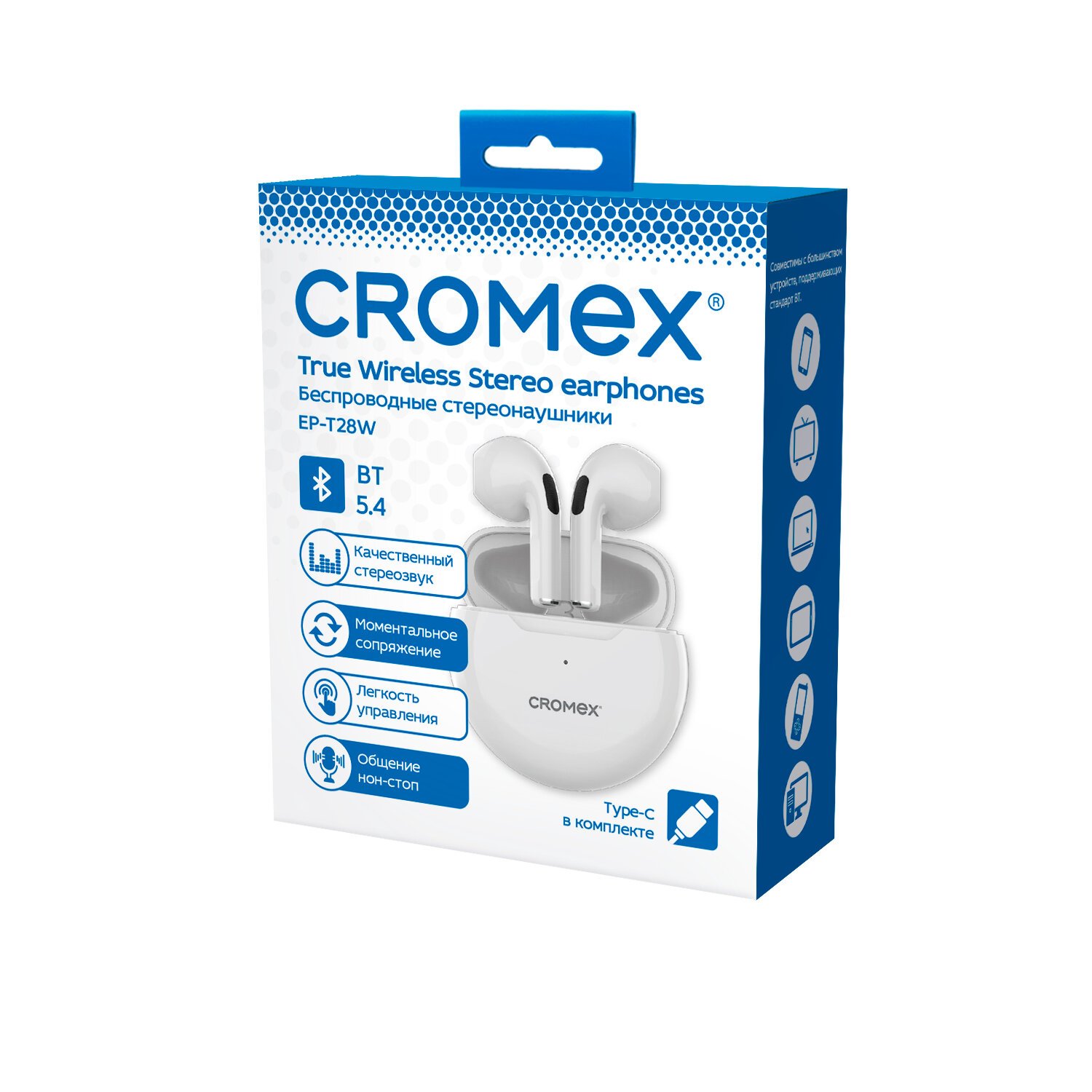 Беспроводные наушники с микрофоном CROMEX EP-T28W – незаменимый аксессуар для прослушивания музыки, аудиокниг, лекций и подкастов, а также для телефонных разговоров на прогулке, во время занятия спортом, на отдыхе, за рулем.
