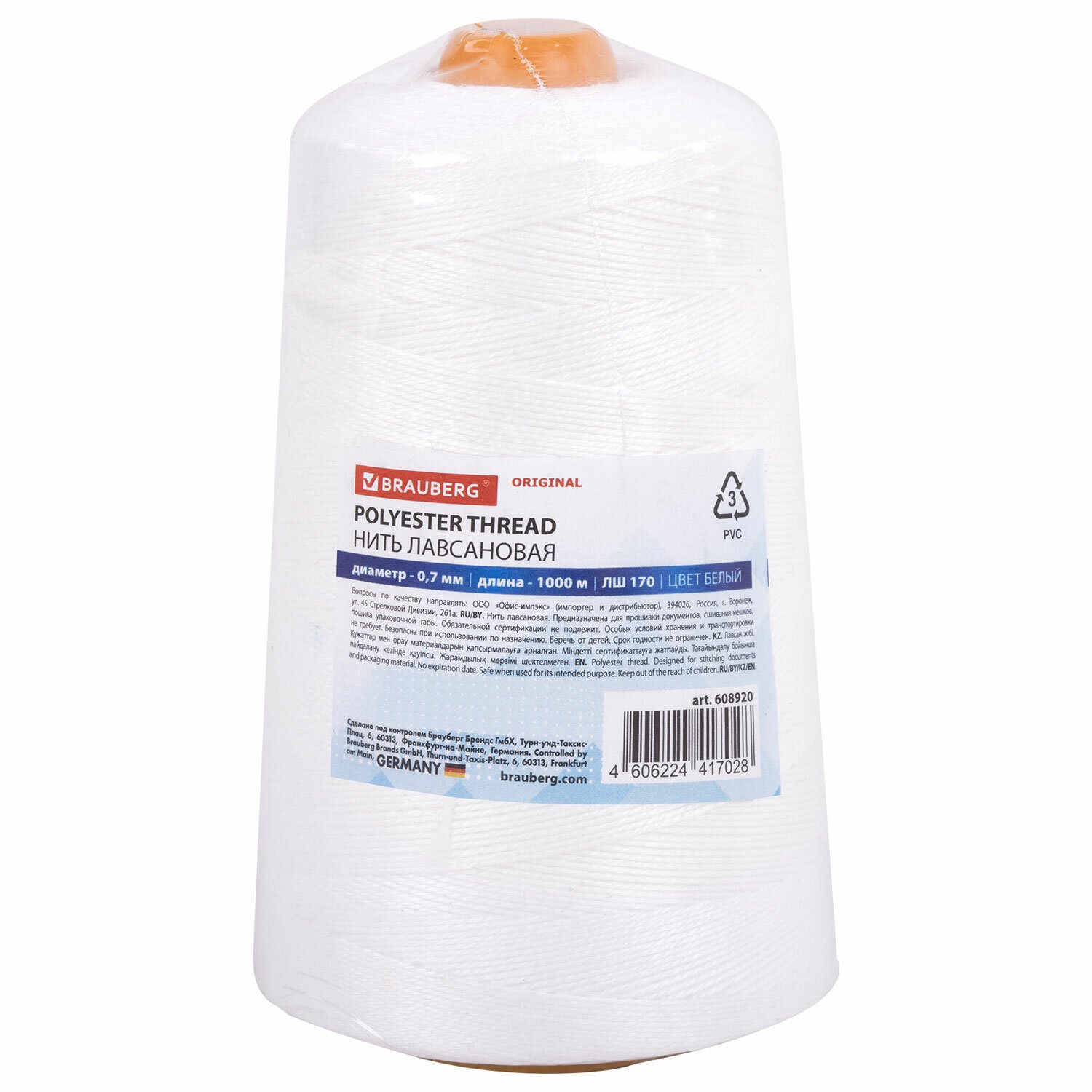 Нить лавсановая для прошивки документов, БЕЛАЯ, диаметр 0,7 мм, длина 1000 м, ЛШ 170, BRAUBERG, 604989