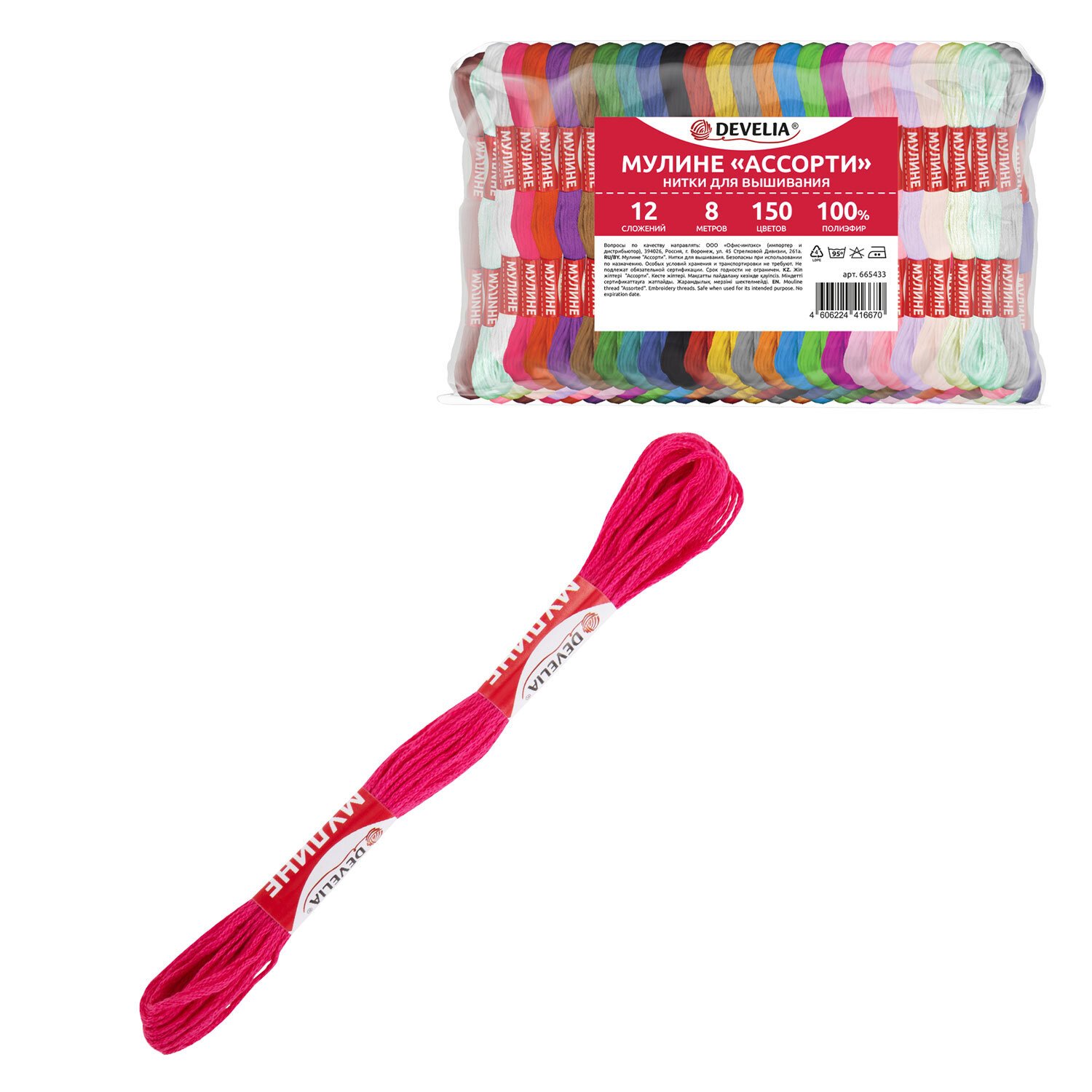 Набор ниток мулине DEVELIA представляет собой меганабор из 150 мотков ниток самых разнообразных цветов в 12 сложений в намотке по 8 метров. Это самый большой набор ниток мулине в ассортименте бренда DEVELIA. Поставляются в прозрачном полипропиленовом пакете.