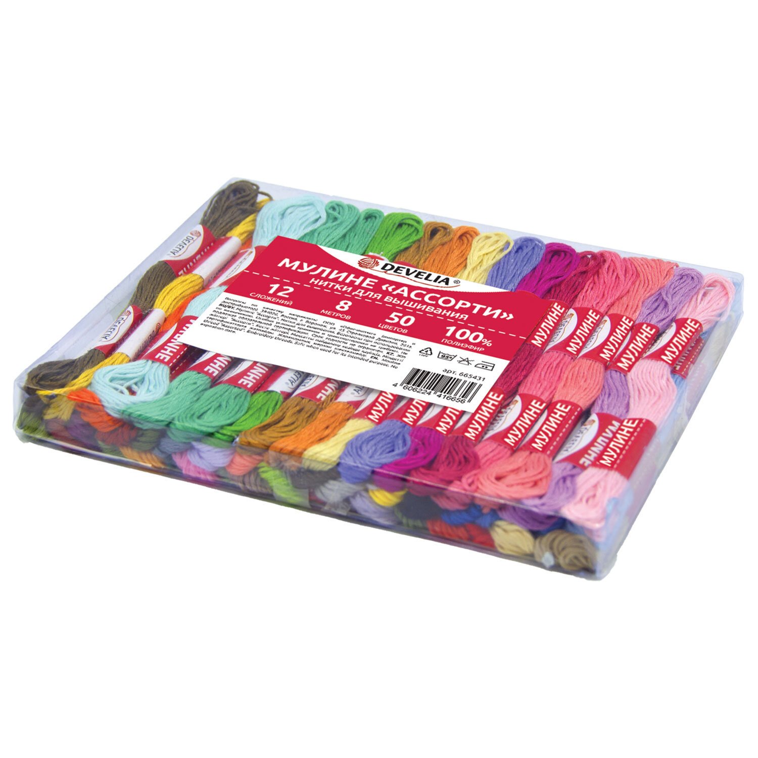 Набор ниток мулине DEVELIA состоит из 50 мотков ниток ярких цветов в 12 сложений в намотке по 8 метров. Поставляются в пластиковом прозрачном боксе с удобной крышкой.