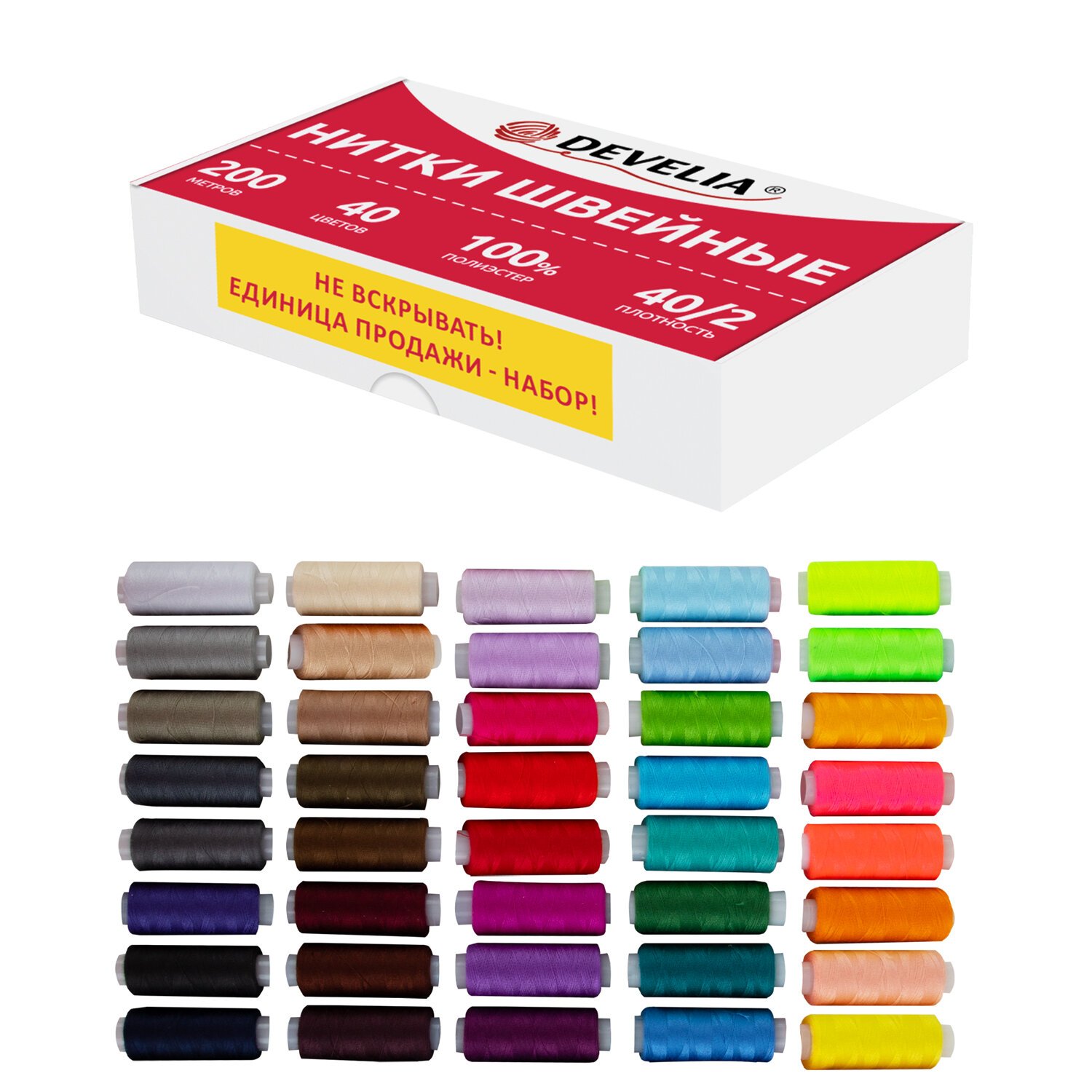 Нитки швейные 40/2 200 м, полиэстер, НАБОР 40 цветов, DEVELIA (Девелиа), 609628