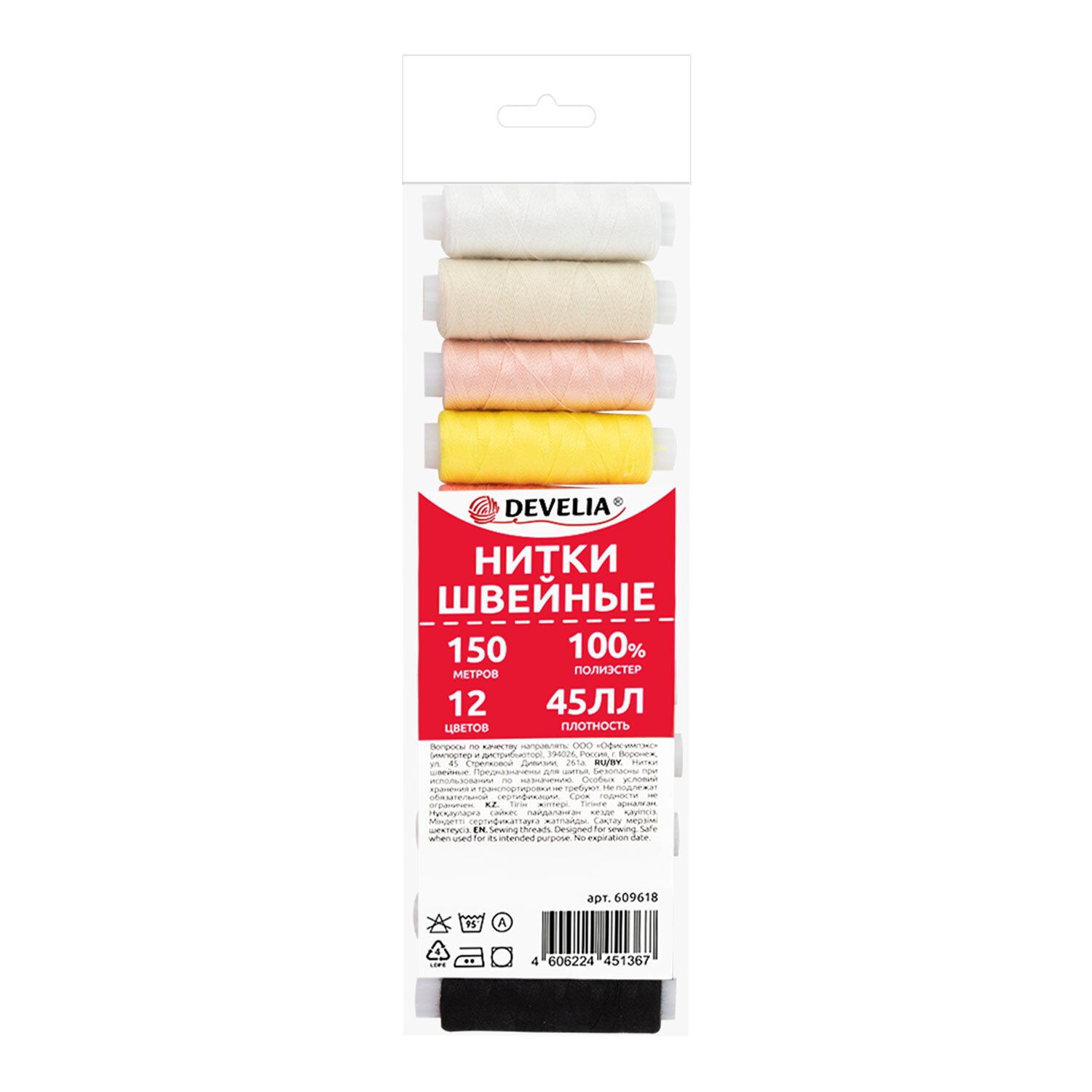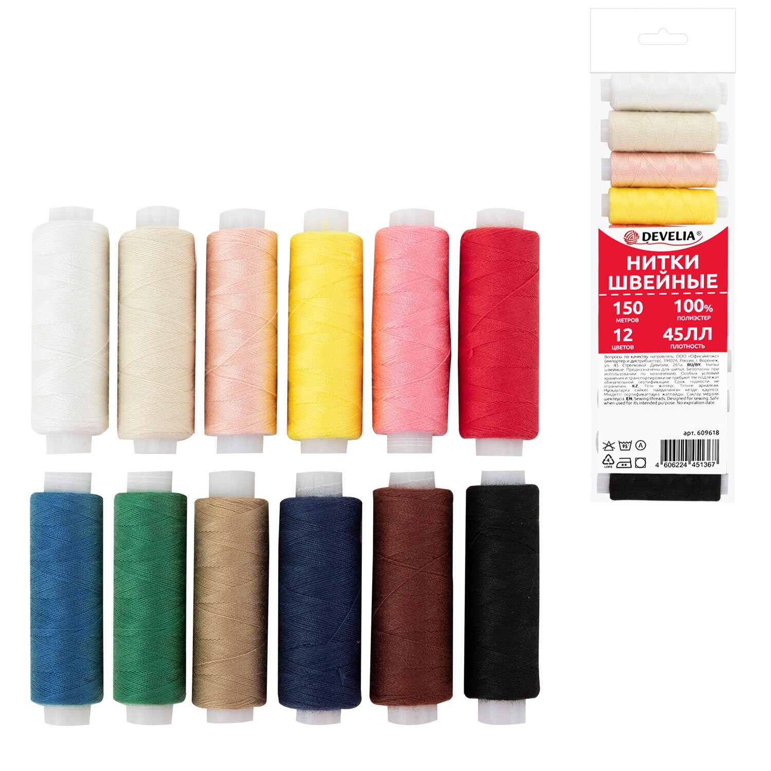 Нитки швейные 45ЛЛ 150 м, полиэстер, НАБОР 12 цветов, DEVELIA (Девелиа), 609618