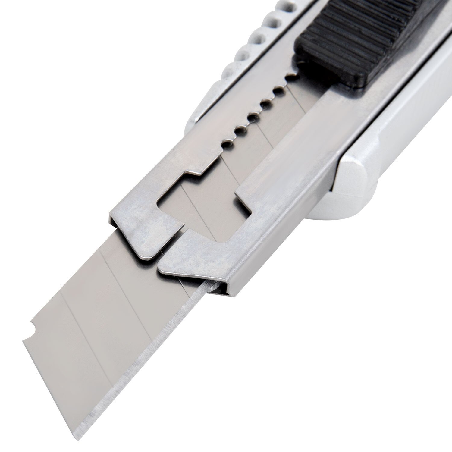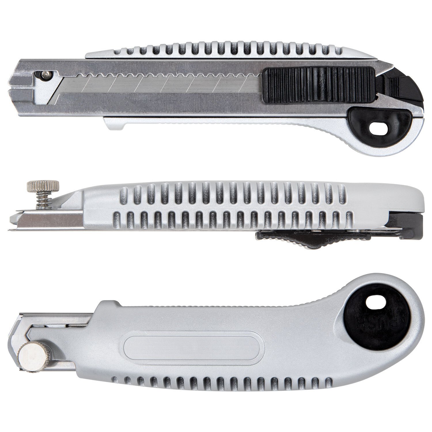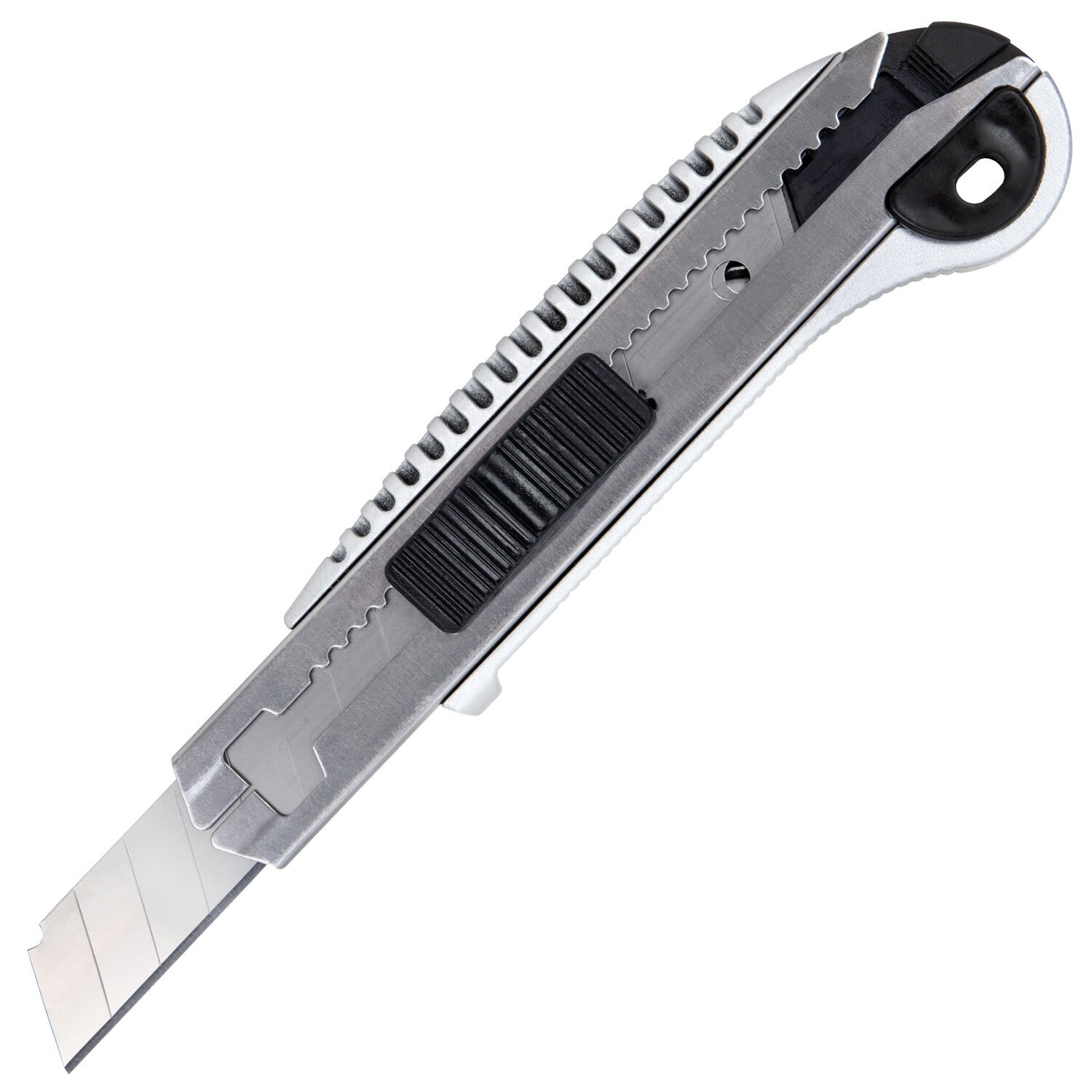 Благодаря своей обтекаемой форме нож удобно держать в руке. Пластиковый корпус гарантирует безопасность применения. Автофиксатор позволяет закрепить лезвие в нужном положении с помощью защелки. Для того, чтобы хранить и переносить инструмент было проще, в корпусе имеется небольшое отверстие. Нож усиленный с металлическими направляющими, которые надежно удерживают лезвие шириной 18 мм и позволяют выдерживать большую нагрузку.