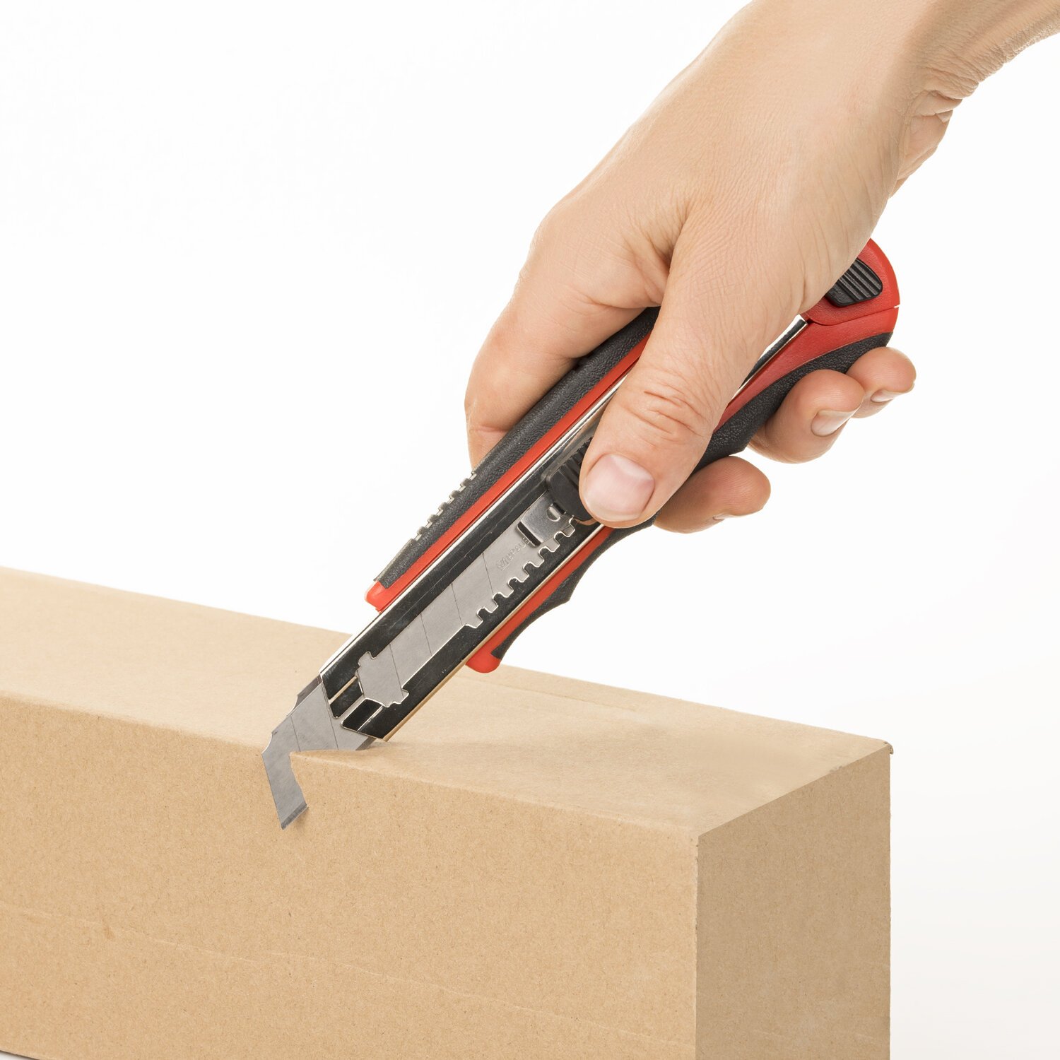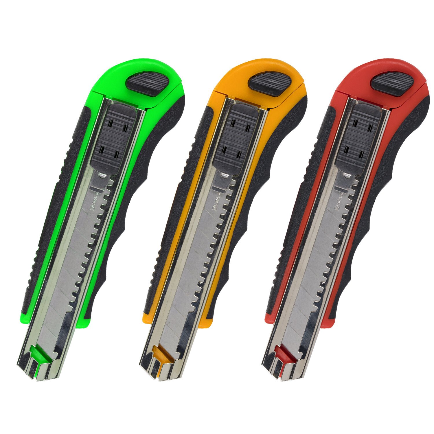 Нож снабжен автоматическим фиксатором лезвия шириной 18 мм. Края инструмента резиновые, предотвращают скольжение руки при работе. Затупившаяся часть отламывается, а по укорачивании одно лезвие легко сменяется другим с помощью механизма автозамены лезвий (к ножу прилагается дополнительные лезвия). Крепкий корпус из пластика исключает опасность получения травмы при работе с ножом. Нож поставляется в блистере с европодвесом. Поставляется в нескольких вариантах цвета (без возможности выбора). Оцените качество заточки канцелярского ножа BRAUBERG "Universal" с 5 запасными лезвиями.