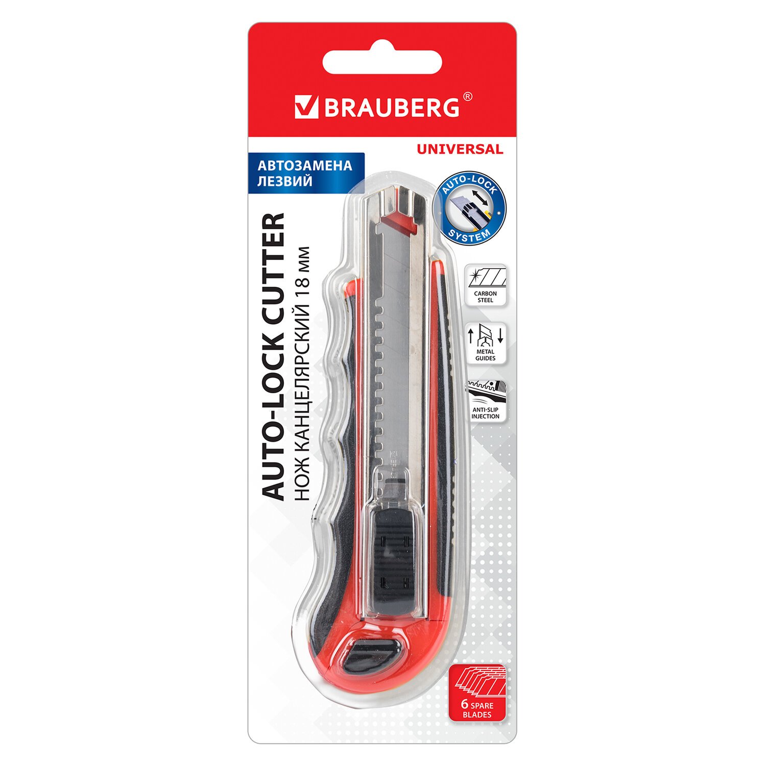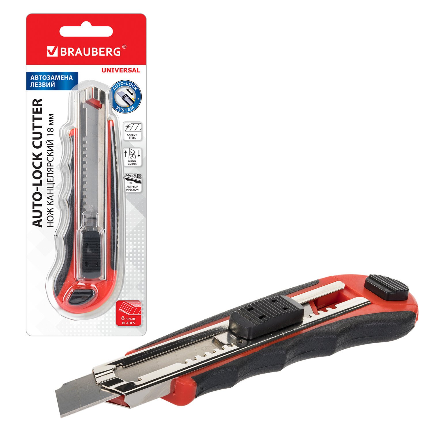 Нож канцелярский 18 мм BRAUBERG "Universal" с АВТОЗАМЕНОЙ ЛЕЗВИЙ, 6 лезвий в комплекте, автофиксатор, 230922